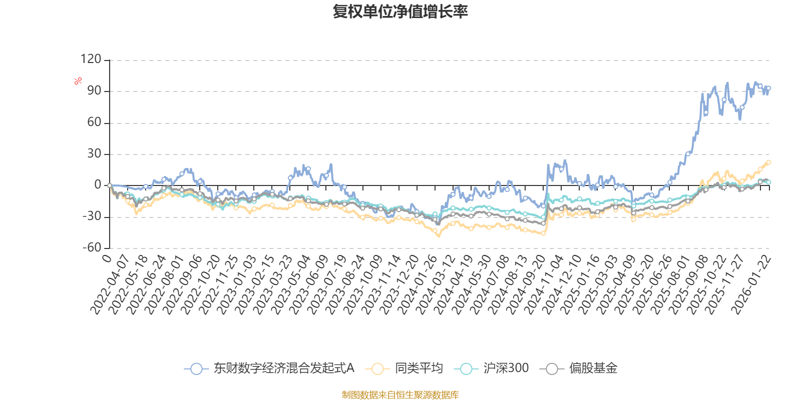 截至1月22日,东财数字经济混合发起式A近三个月复权单位净值增长率为6.01%,位于同类可比基金196/229;近半年复权单位净值增长率为59.42%,位于同类可比基金96/229;近一年复权单位净值增长率为76.54%,位于同类可比基金57/222;近三年复权单位净值增长率为107.28%,位于同类可比基金22/165。