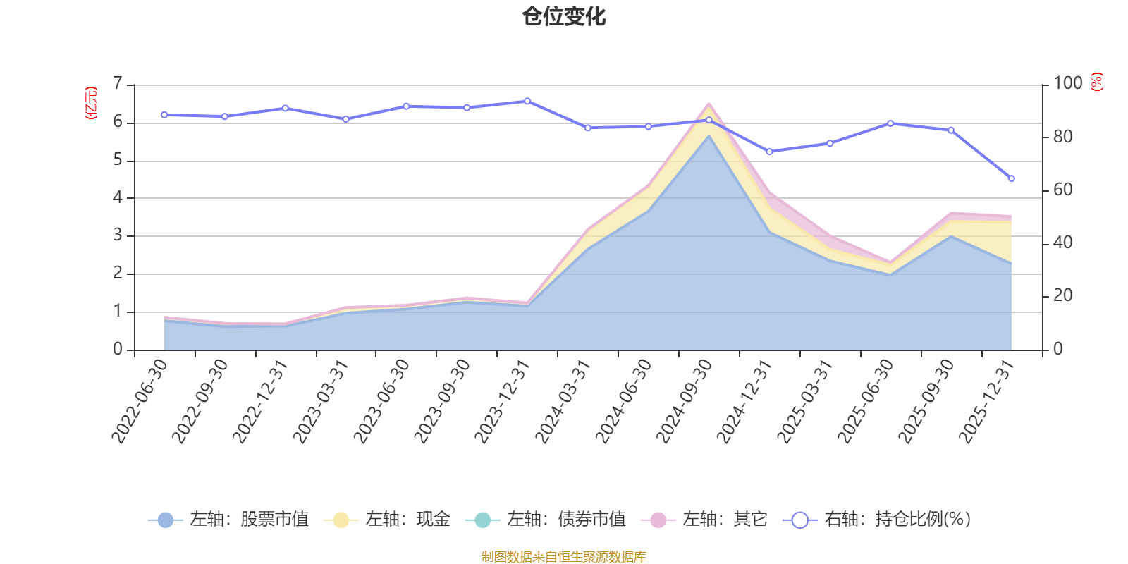 据定期报告数据统计,近三年平均股票仓位为83.67%,同类平均为86.9%。2023年末基金达到93.78%的最高仓位,2025年末最低,为64.64%。