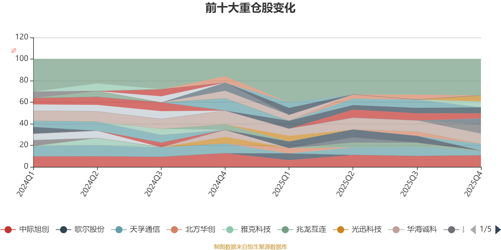 该基金持股集中度较高。截至2025年四季度末,基金十大重仓股分别是中际旭创、新易盛、工业富联、沪电股份、寒武纪、东山精密、立讯精密、生益电子、胜宏科技、天孚通信。