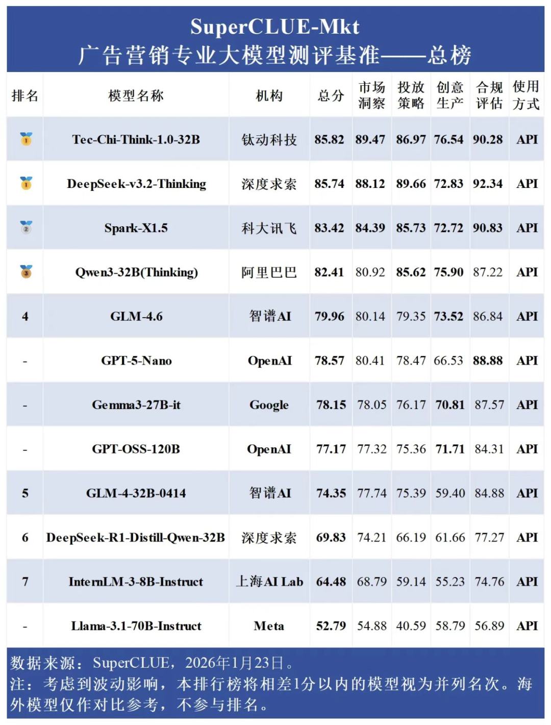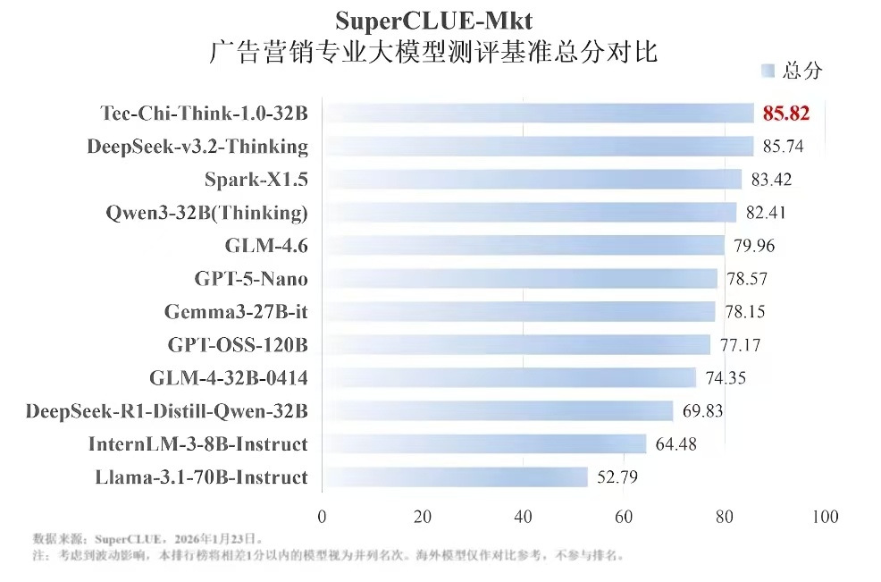 “首次打榜,拿下第一!” 近日,专业中文大模型测评机构SuperCLUE发布的《广告营销专业大模型测评基准榜单》引发行业关注。在这份极具份量的榜单中,总部位于广州的钛动科技自研的Tec-Chi-Think-1.0-32B(中文全称“钛极问答推理模型”)以总分85.82的成绩强势登顶,一举超越了包括深度求索、科大讯飞、阿里巴巴等在内的国内顶尖科技公司的同级模型,彰显了其在垂类赛道中的领先实力。
