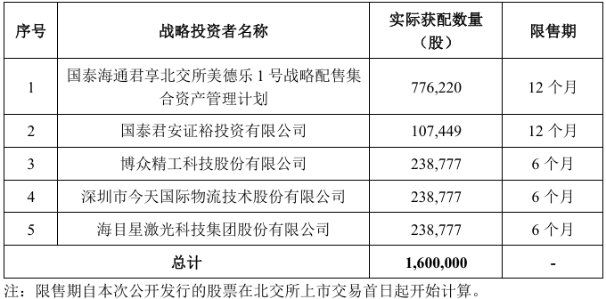美德乐本次发行战略配售发行数量为160万股,占本次发行数量的10%,发行价格为41.88元/股,战略配售募集资金金额合计6700.80万元。
