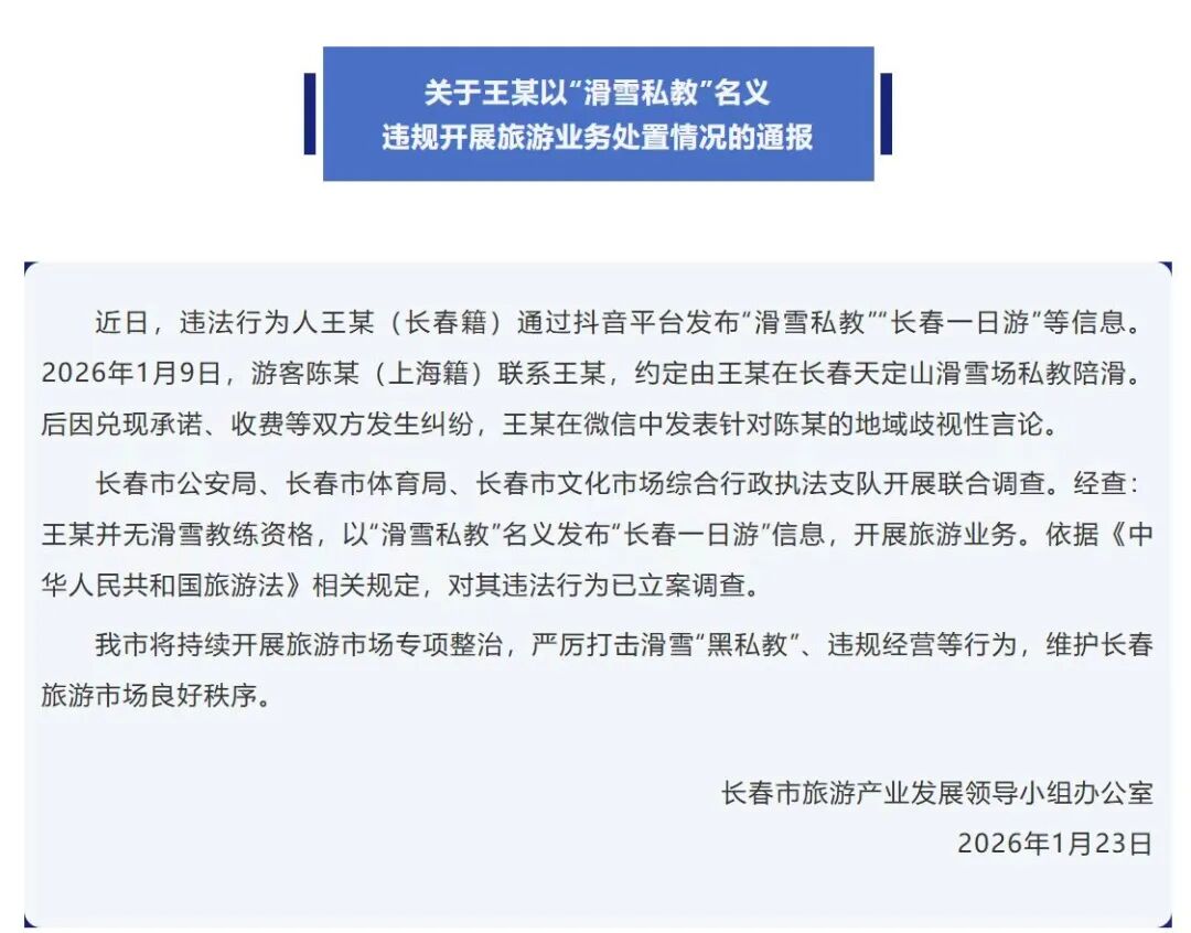 1月23日,长春文旅发布《关于王某以“滑雪私教”名义违规开展旅游业务处置情况的通报》。
