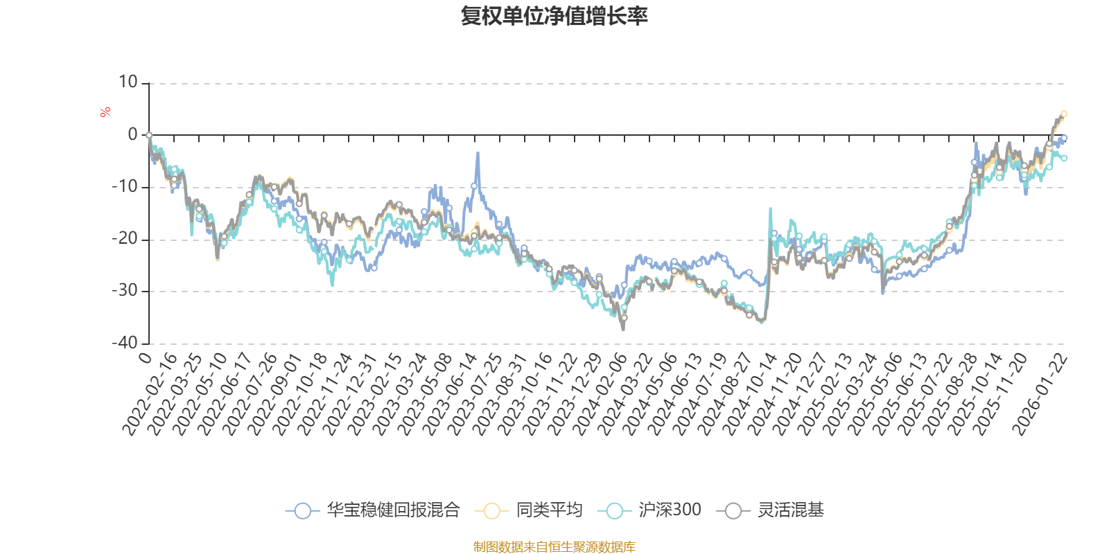 截至1月22日,华宝稳健回报混合近三个月复权单位净值增长率为5.42%,位于同类可比基金831/1286;近半年复权单位净值增长率为27.63%,位于同类可比基金485/1286;近一年复权单位净值增长率为28.11%,位于同类可比基金748/1286;近三年复权单位净值增长率为23.54%,位于同类可比基金484/1286。