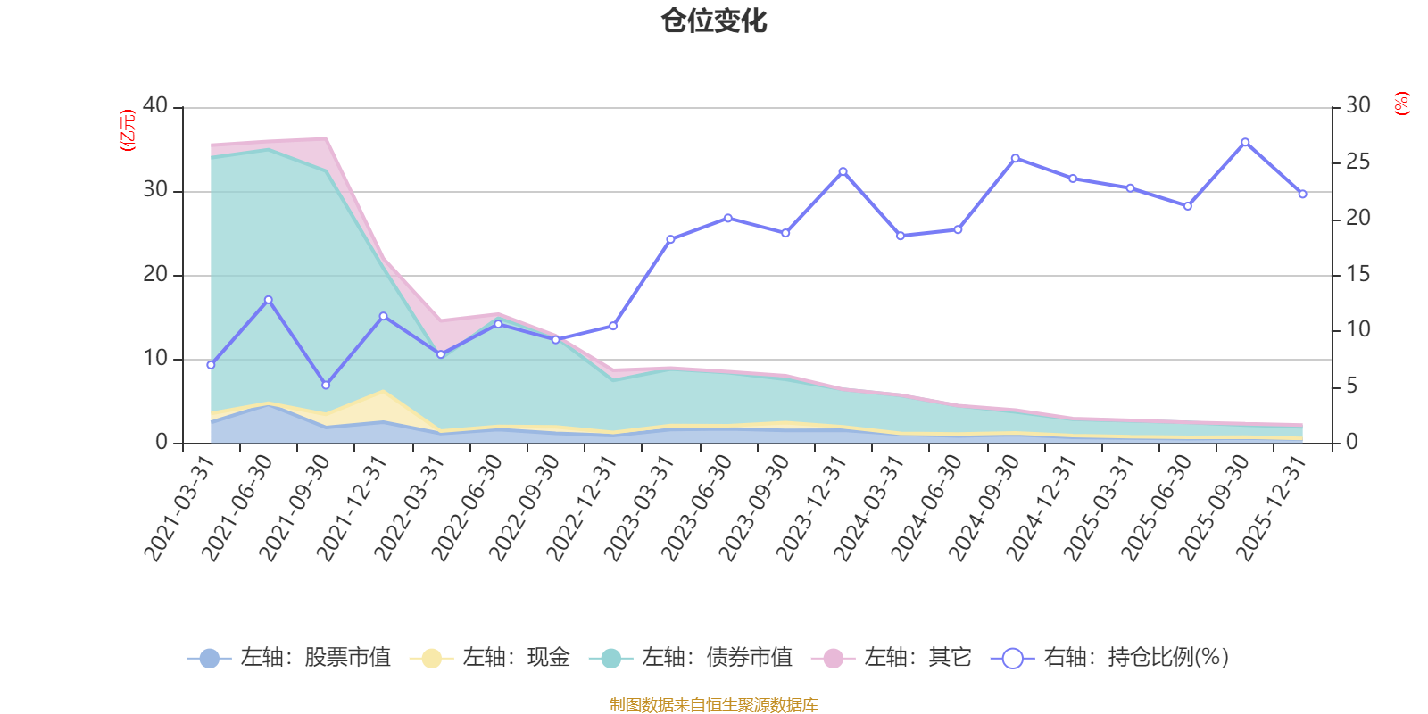 据定期报告数据统计,近三年平均股票仓位为21.75%,同类平均为19.2%。2025年三季度末基金达到26.87%的最高仓位,2021年三季度末最低,为5.18%。