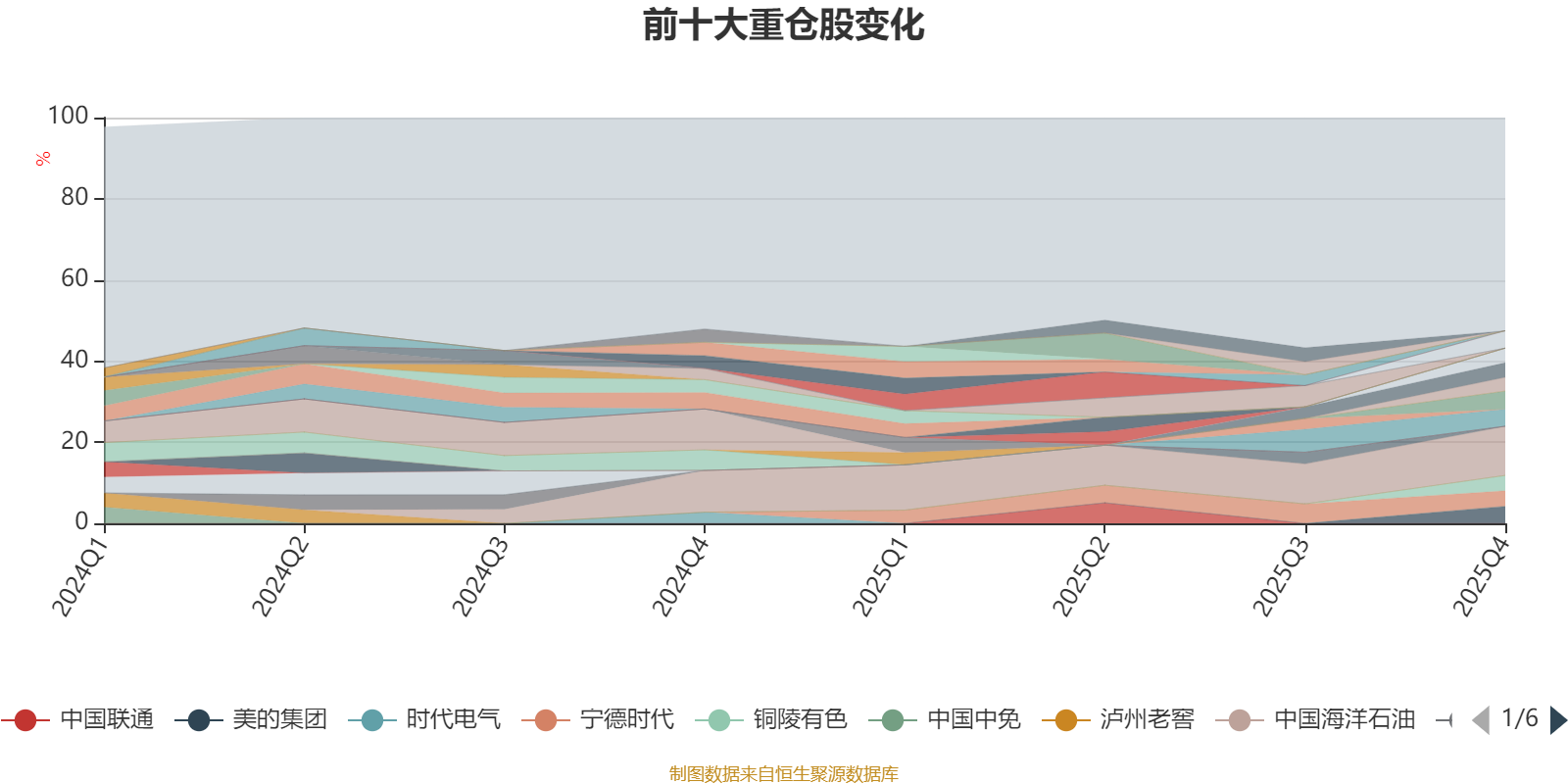 截至2025年四季度末,基金十大重仓股分别是中国海洋石油、三角防务、中国平安、美的集团、国电电力、宁德时代、铜陵有色、紫金矿业、伊利股份、腾讯控股。