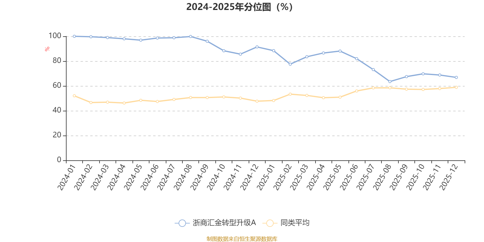 通过所选区间该基金净值增长率分位图,可以观察该基金与同类基金业绩比较情况。图为坐标原点到区间内某时点的净值增长率在同类基金中的分位数。