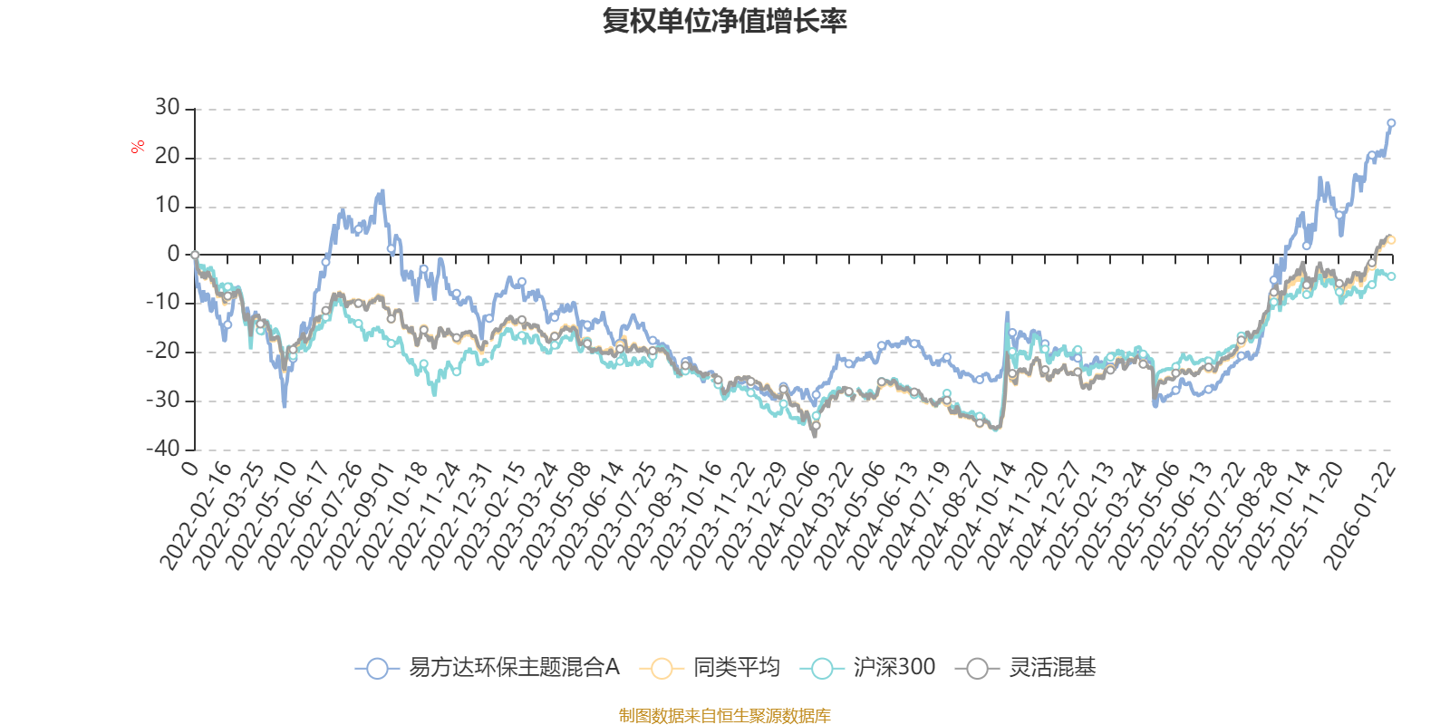 截至1月22日,易方达环保主题混合A近三个月复权单位净值增长率为20.54%,位于同类可比基金123/1286;近半年复权单位净值增长率为60.24%,位于同类可比基金88/1286;近一年复权单位净值增长率为63.34%,位于同类可比基金185/1286;近三年复权单位净值增长率为36.42%,位于同类可比基金304/1286。