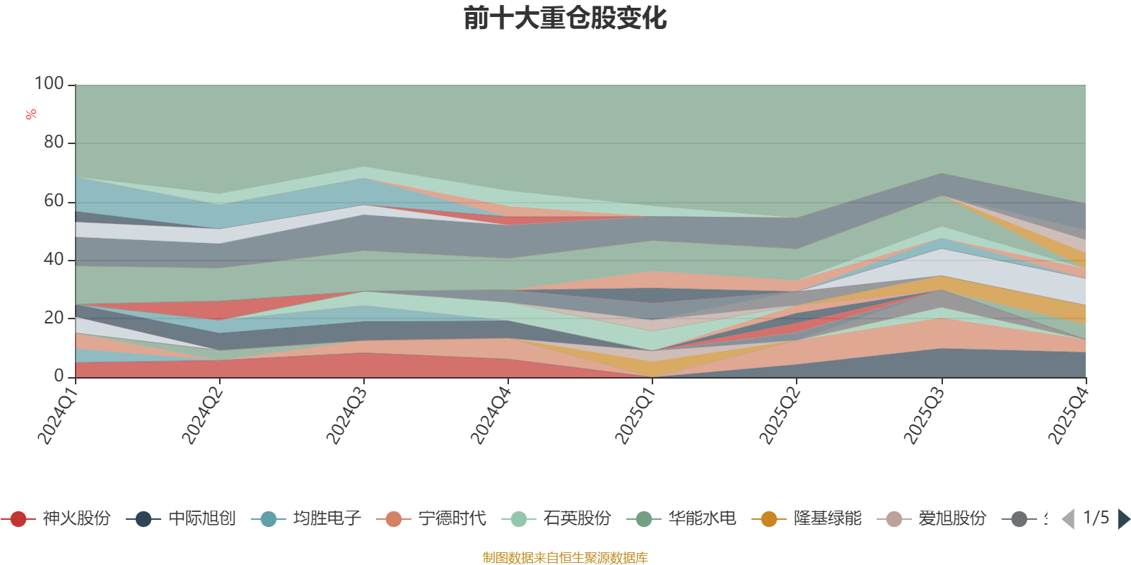 该基金持股集中度较高。截至2025年四季度末,基金十大重仓股分别是新易盛、长江电力、中际旭创、博迁新材、三环集团、领益智造、浪潮信息、宁德时代、恒逸石化、立讯精密。