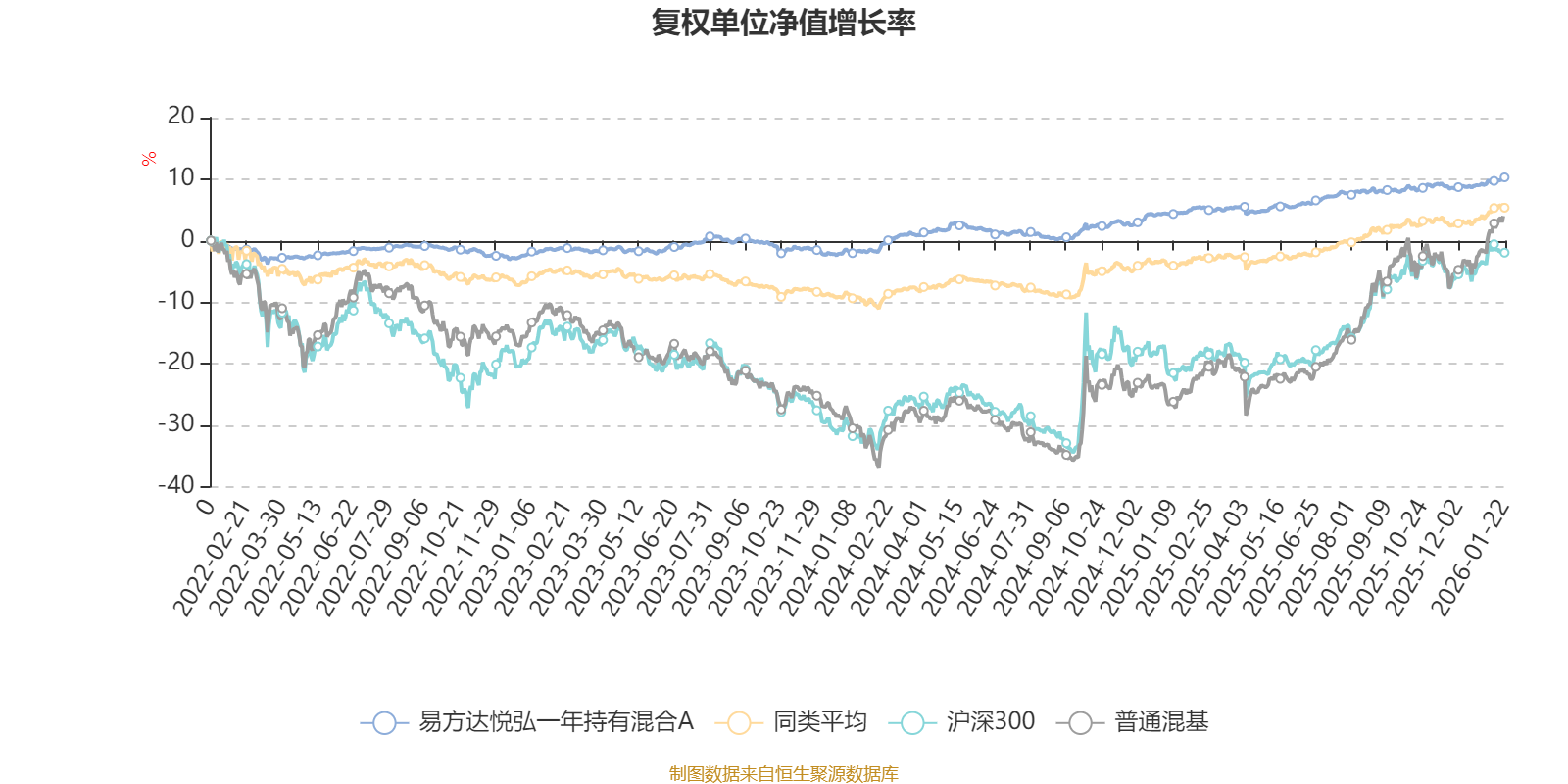 截至1月22日,易方达悦弘一年持有混合A近三个月复权单位净值增长率为1.78%,位于同类可比基金370/629;近半年复权单位净值增长率为2.12%,位于同类可比基金510/629;近一年复权单位净值增长率为5.50%,位于同类可比基金453/626;近三年复权单位净值增长率为11.98%,位于同类可比基金268/564。