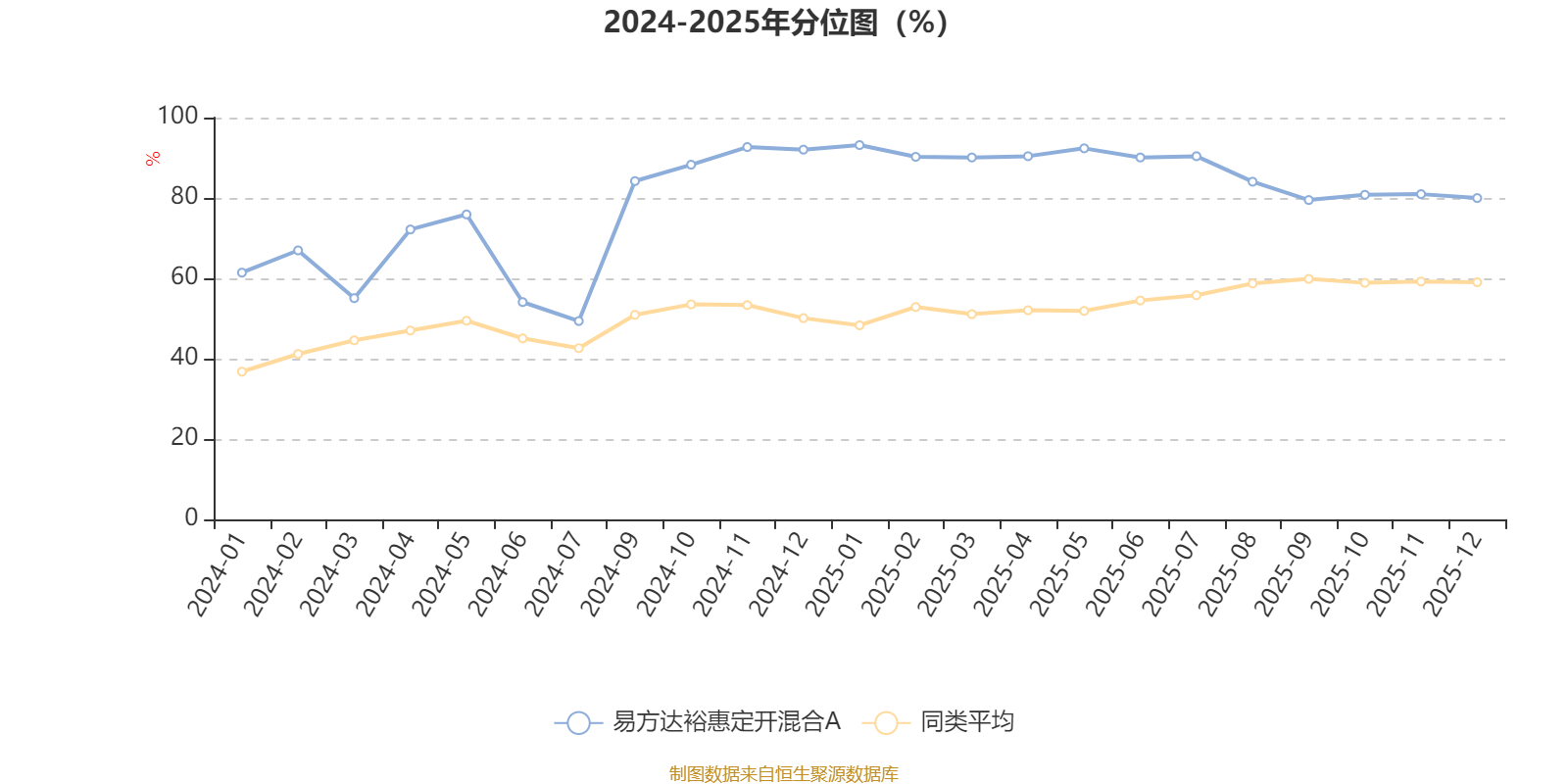 通过所选区间该基金净值增长率分位图,可以观察该基金与同类基金业绩比较情况。图为坐标原点到区间内某时点的净值增长率在同类基金中的分位数。