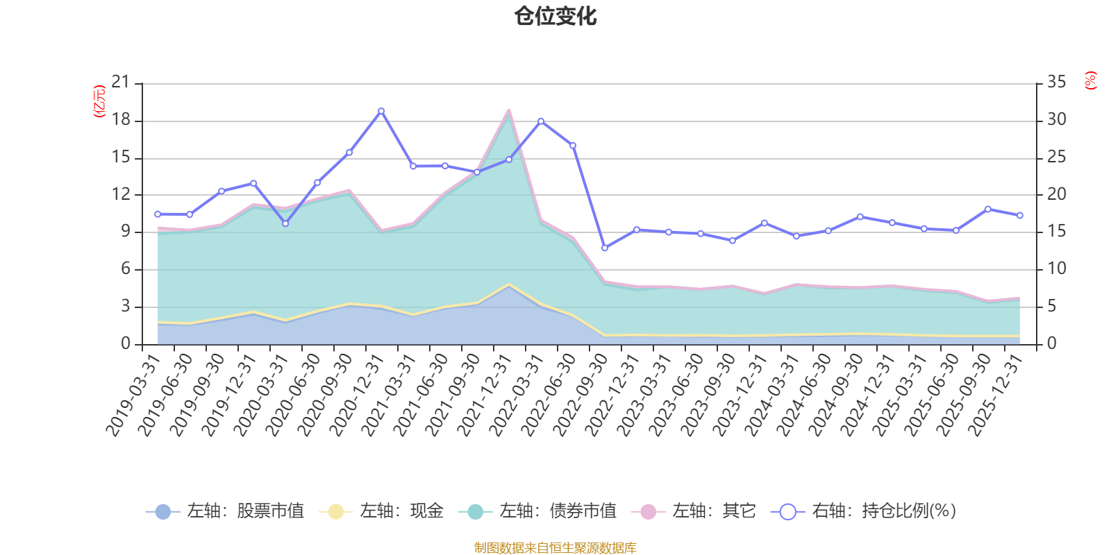 据定期报告数据统计,近三年平均股票仓位为15.79%,同类平均为72.57%。2020年末基金达到31.28%的最高仓位,2022年三季度末最低,为12.94%。