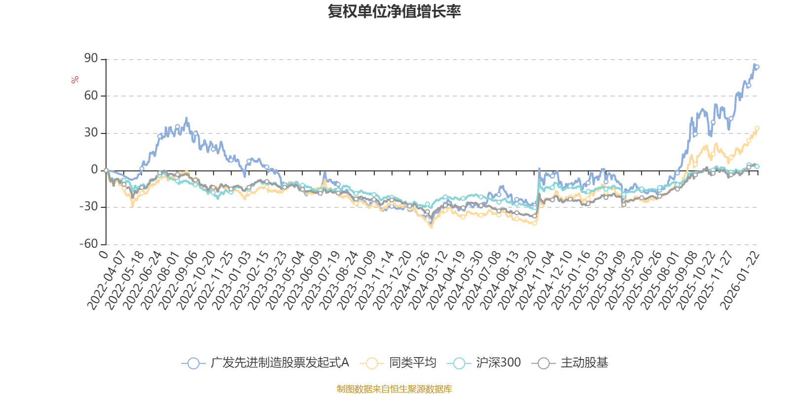 截至1月22日,广发先进制造股票发起式A近三个月复权单位净值增长率为32.14%,位于同类可比基金3/63;近半年复权单位净值增长率为95.81%,位于同类可比基金1/63;近一年复权单位净值增长率为86.83%,位于同类可比基金9/62;近三年复权单位净值增长率为70.07%,位于同类可比基金24/52。