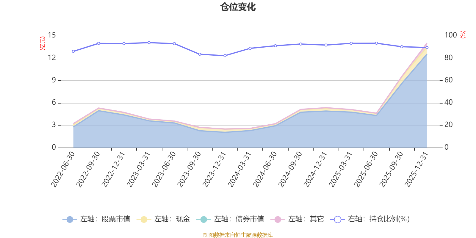 据定期报告数据统计,近三年平均股票仓位为90.21%,同类平均为88.36%。2023年一季度末基金达到93.84%的最高仓位,2023年末最低,为82.17%。