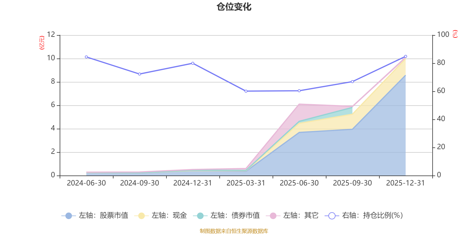 据定期报告数据统计,成立以来平均股票仓位为72.69%,同类平均为85.83%。2025年末基金达到84.86%的最高仓位,2025年一季度末最低,为60.08%。