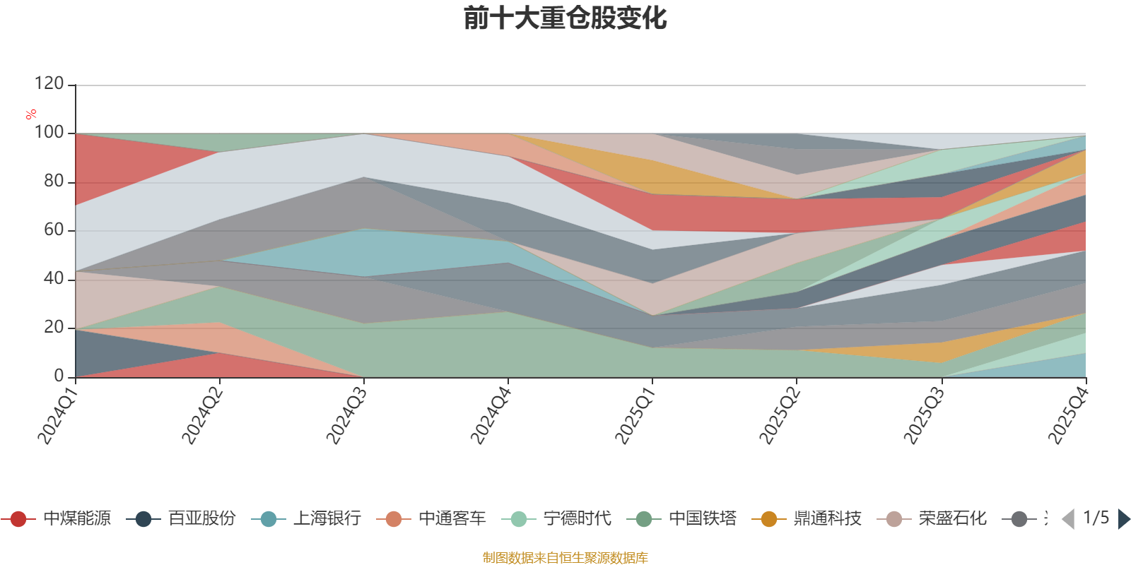 该基金持股集中度较高,近2年前十大重仓股集中度长期超过60%。截至2025年四季度末,基金十大重仓股分别是腾讯控股、兴业银行、华新建材、中广核矿业、上海银行、国泰海通、三环集团、宁德时代、中国铁塔、精工钢构。