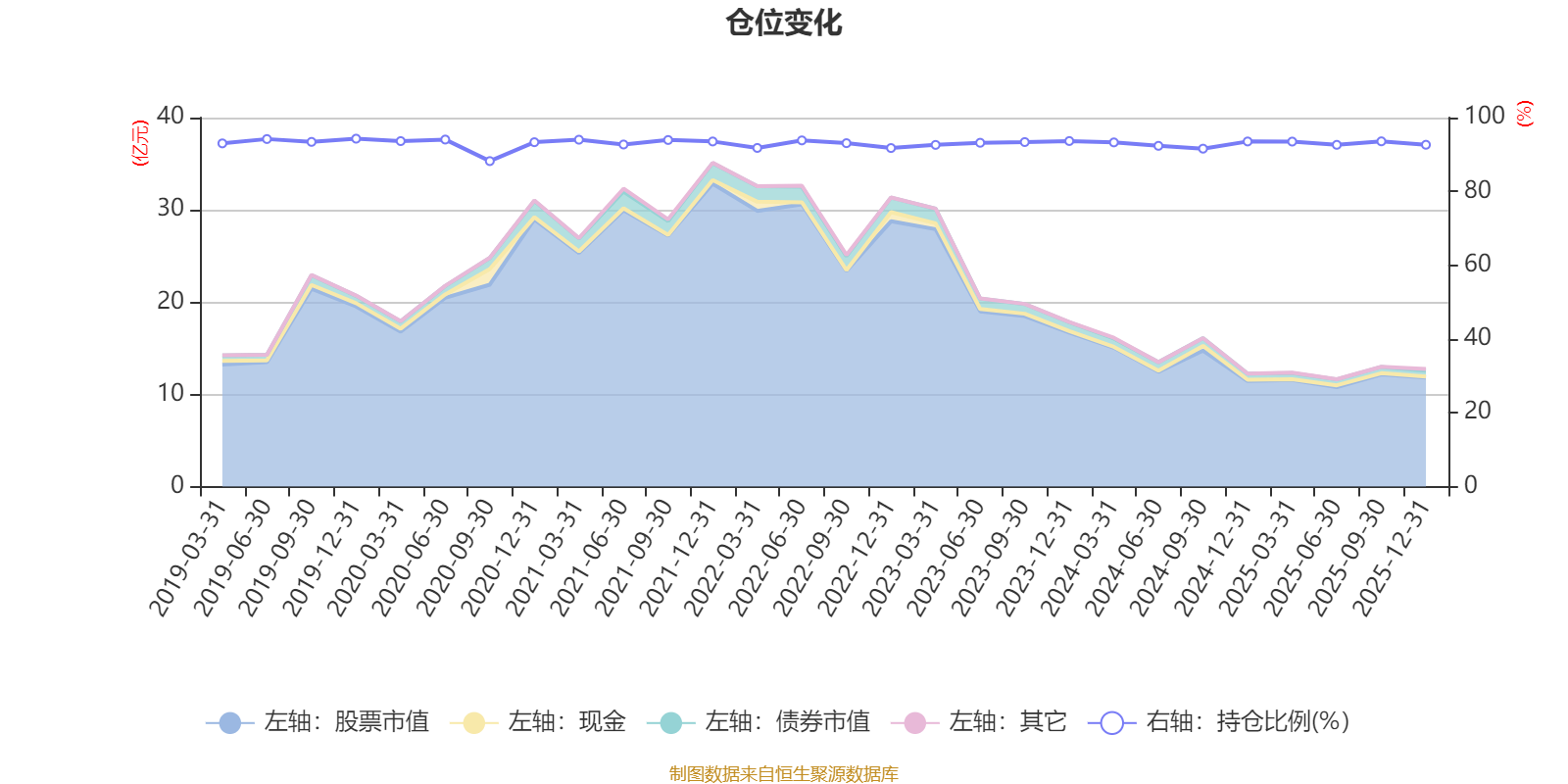 据定期报告数据统计,近三年平均股票仓位为92.99%,同类平均为87.64%。2019年末基金达到94.29%的最高仓位,2020年三季度末最低,为88.21%。