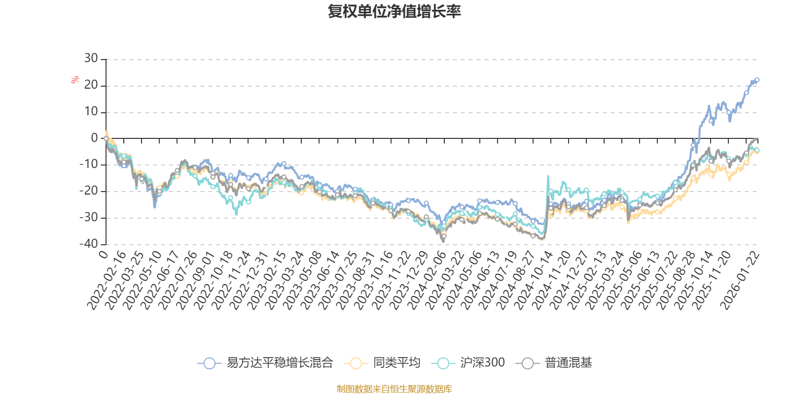 截至1月22日,易方达平稳增长混合近三个月复权单位净值增长率为13.40%,位于同类可比基金28/134;近半年复权单位净值增长率为46.25%,位于同类可比基金7/134;近一年复权单位净值增长率为62.14%,位于同类可比基金12/131;近三年复权单位净值增长率为36.91%,位于同类可比基金24/124。