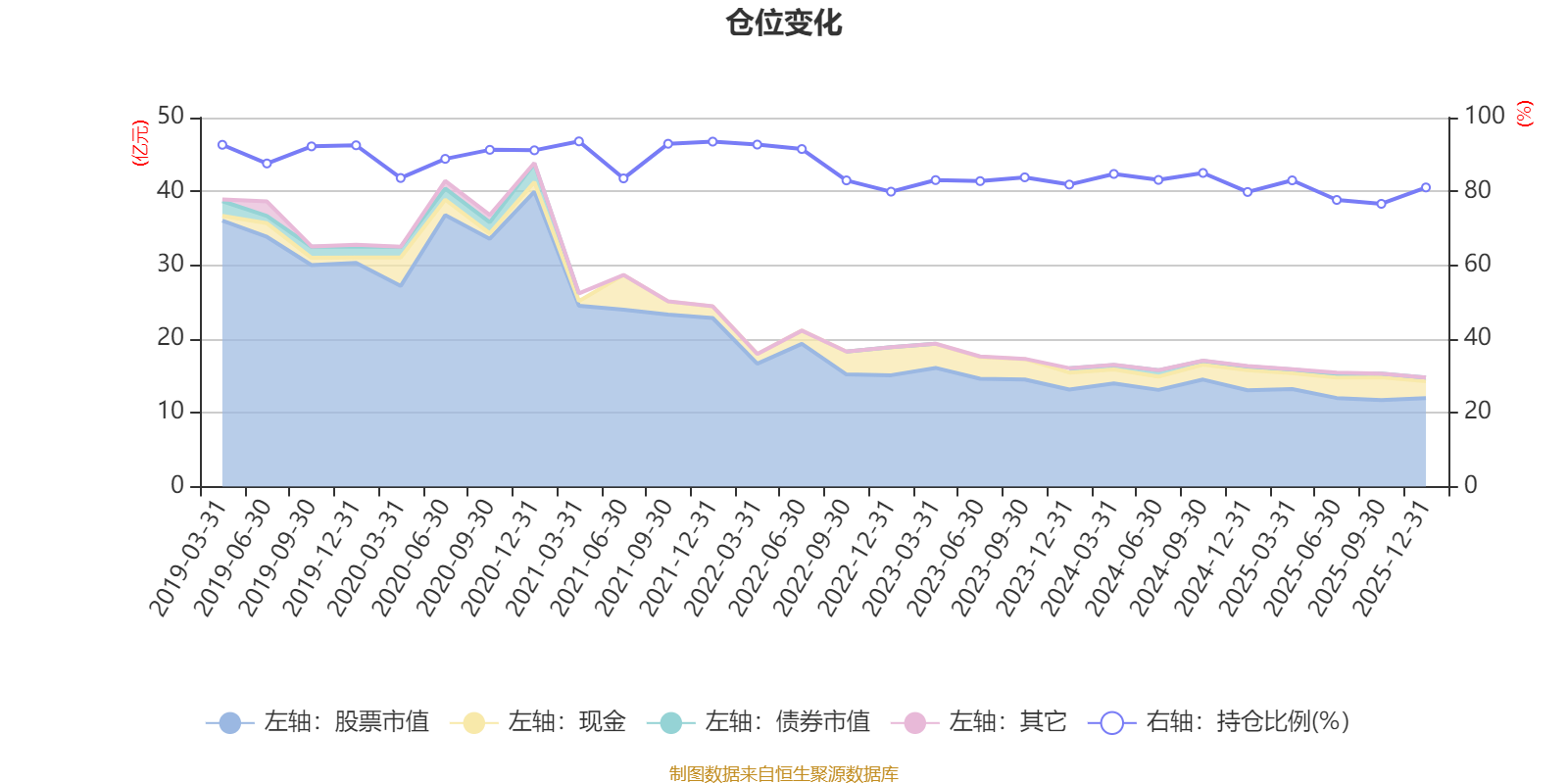 据定期报告数据统计,近三年平均股票仓位为81.88%,同类平均为87.64%。2021年一季度末基金达到93.56%的最高仓位,2025年三季度末最低,为76.63%。