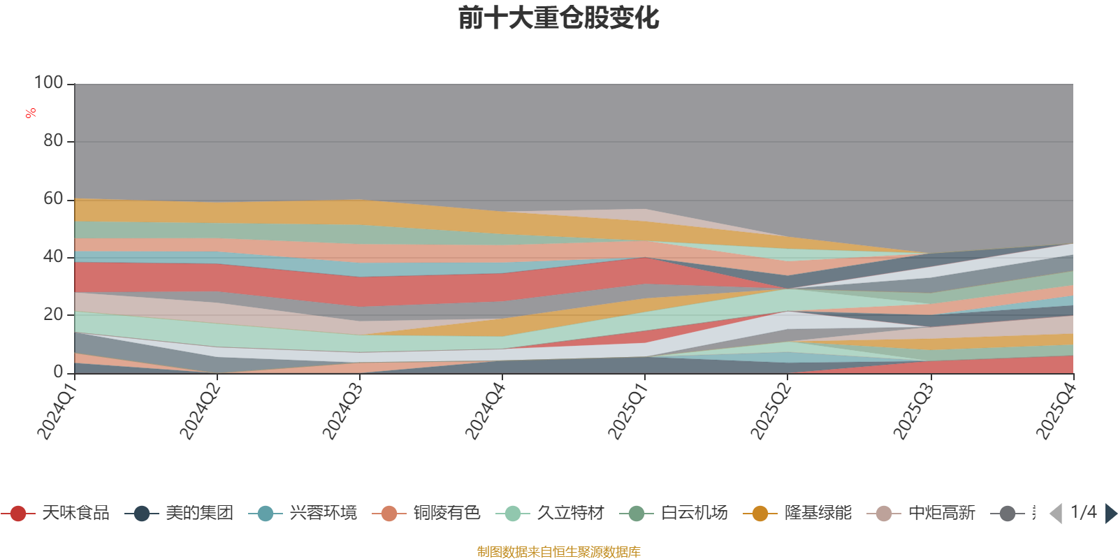 截至2025年四季度末,基金十大重仓股分别是中炬高新、天味食品、欧普照明、洋河股份、景津装备、隆基绿能、白云机场、华帝股份、老板电器、安井食品。