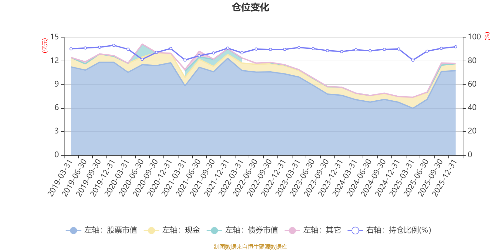 据定期报告数据统计,近三年平均股票仓位为89.12%,同类平均为72.57%。2019年末基金达到93.34%的最高仓位,2025年一季度末最低,为80.76%。