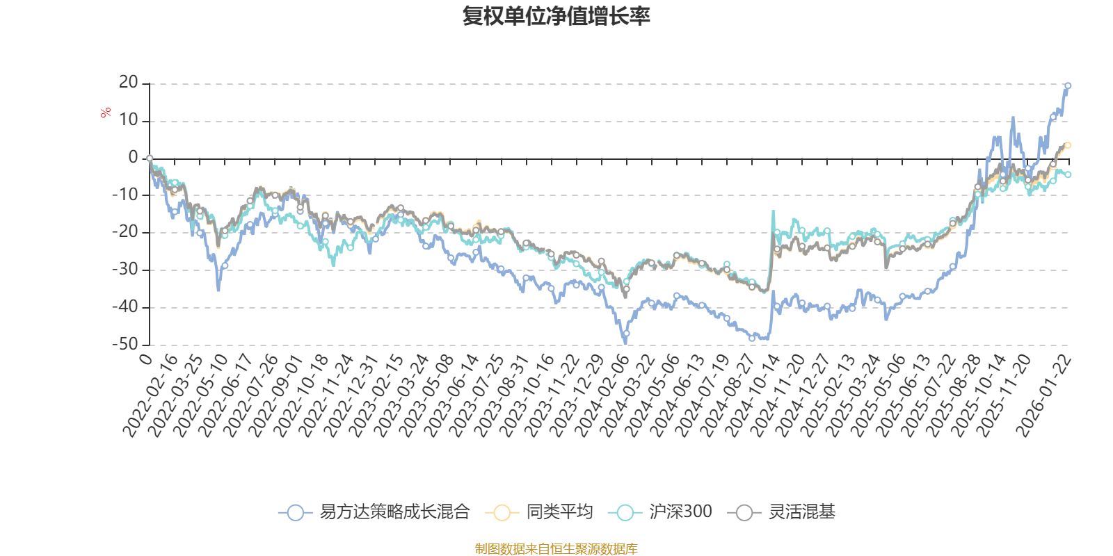 截至1月22日,易方达策略成长混合近三个月复权单位净值增长率为21.36%,位于同类可比基金109/1286;近半年复权单位净值增长率为68.09%,位于同类可比基金48/1286;近一年复权单位净值增长率为96.39%,位于同类可比基金22/1286;近三年复权单位净值增长率为45.59%,位于同类可比基金212/1286。