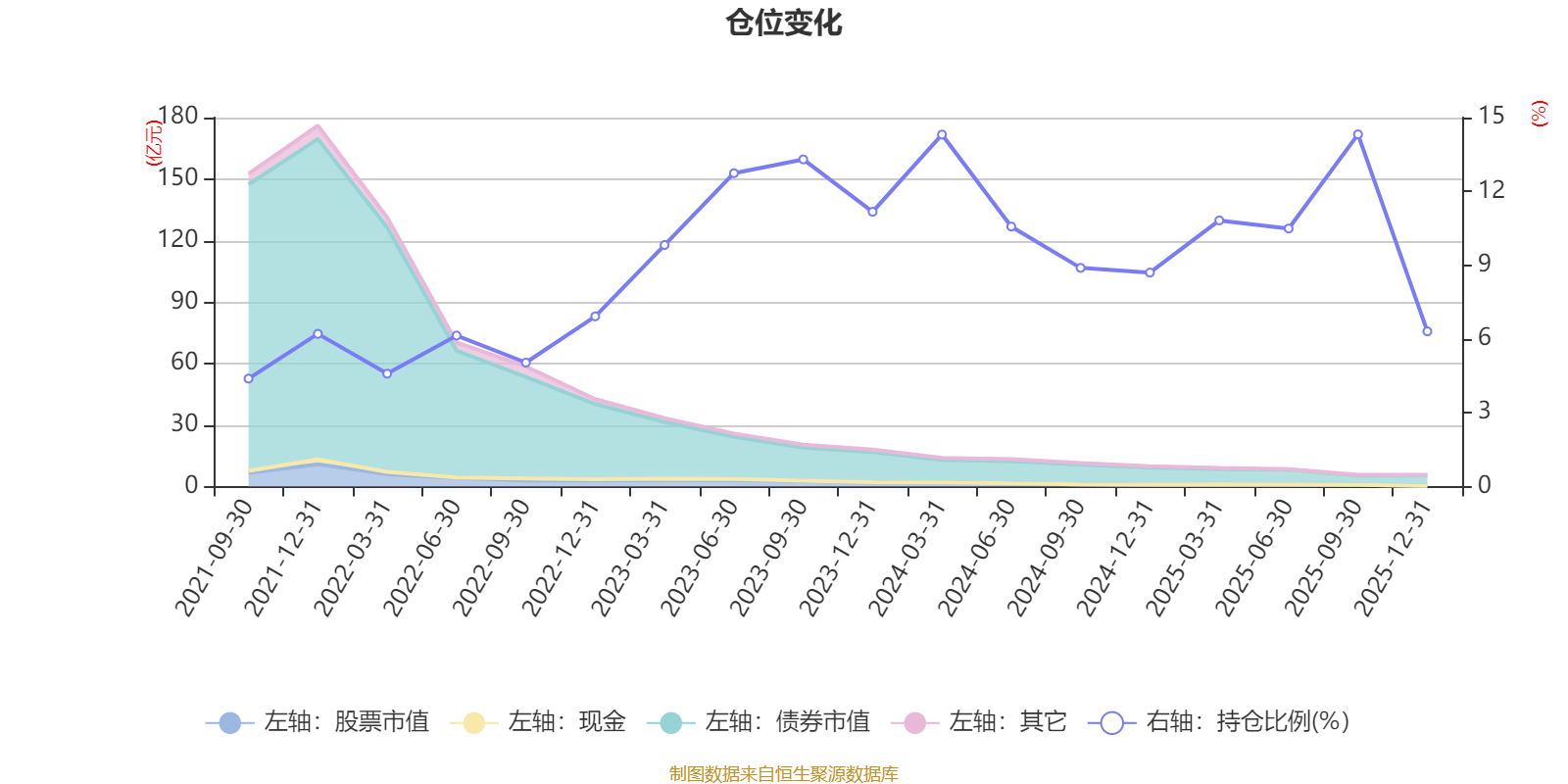 据定期报告数据统计,近三年平均股票仓位为10.95%,同类平均为19.2%。2025年三季度末基金达到14.32%的最高仓位,2021年三季度末最低,为4.39%。