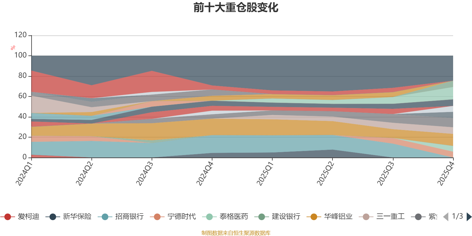 该基金持股集中度较高,近2年前十大重仓股集中度长期超过60%。截至2025年四季度末,基金十大重仓股分别是阿里巴巴-W、华峰铝业、紫金矿业、三一重工、万华化学、长江电力、腾讯控股、伊利股份、宁德时代、泰格医药。