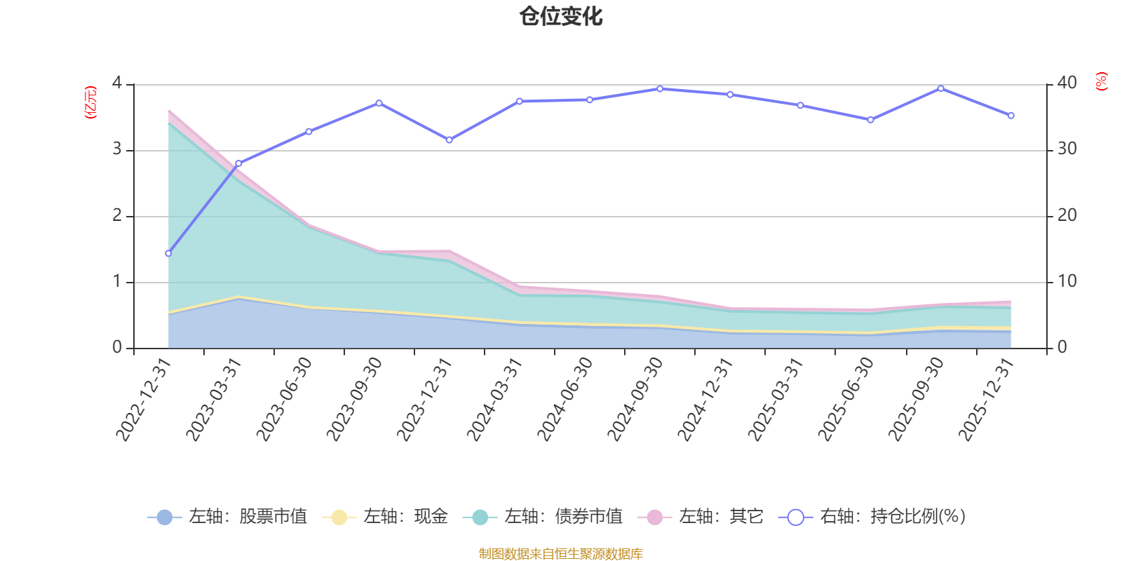据定期报告数据统计,近三年平均股票仓位为35.69%,同类平均为19.2%。2025年三季度末基金达到39.36%的最高仓位,2022年末最低,为14.36%。