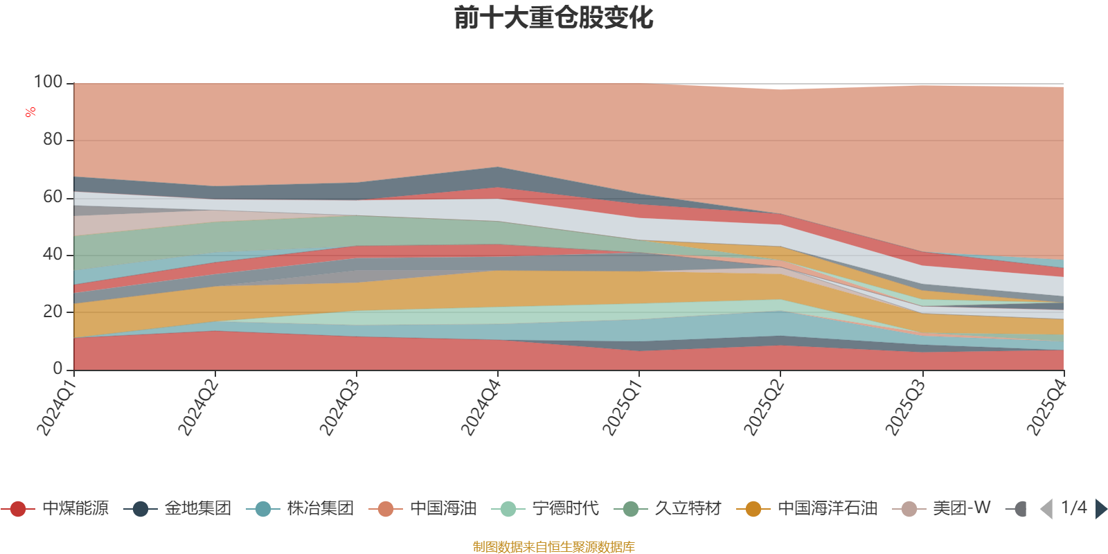 截至2025年四季度末,基金十大重仓股分别是中煤能源、中国国航、中国海洋石油、华泰证券、中信股份、株冶集团、杭州银行、首旅酒店、久立特材、贵州茅台。