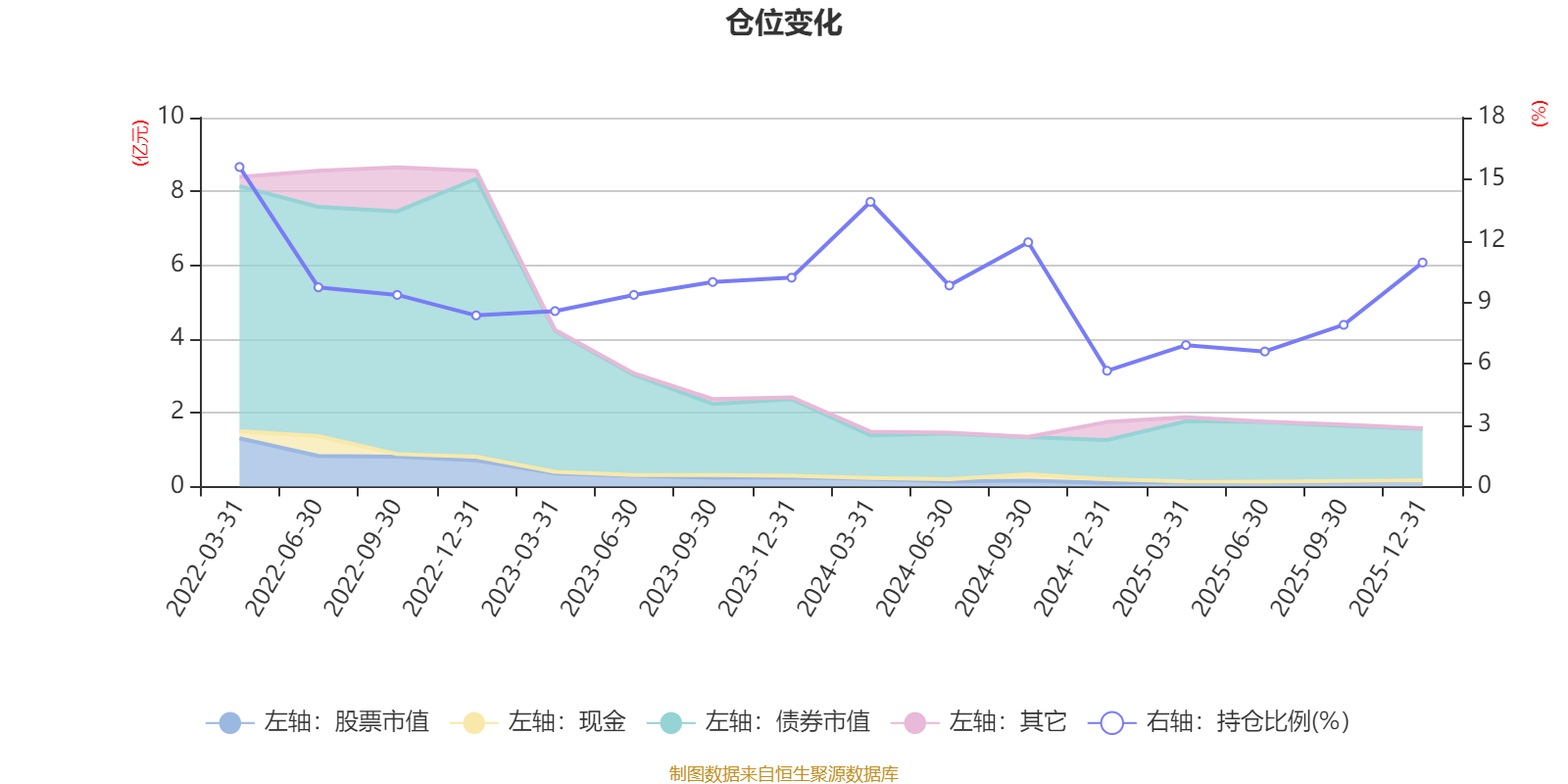 据定期报告数据统计,近三年平均股票仓位为9.31%,同类平均为19.2%。2022年一季度末基金达到15.59%的最高仓位,2024年末最低,为5.65%。
