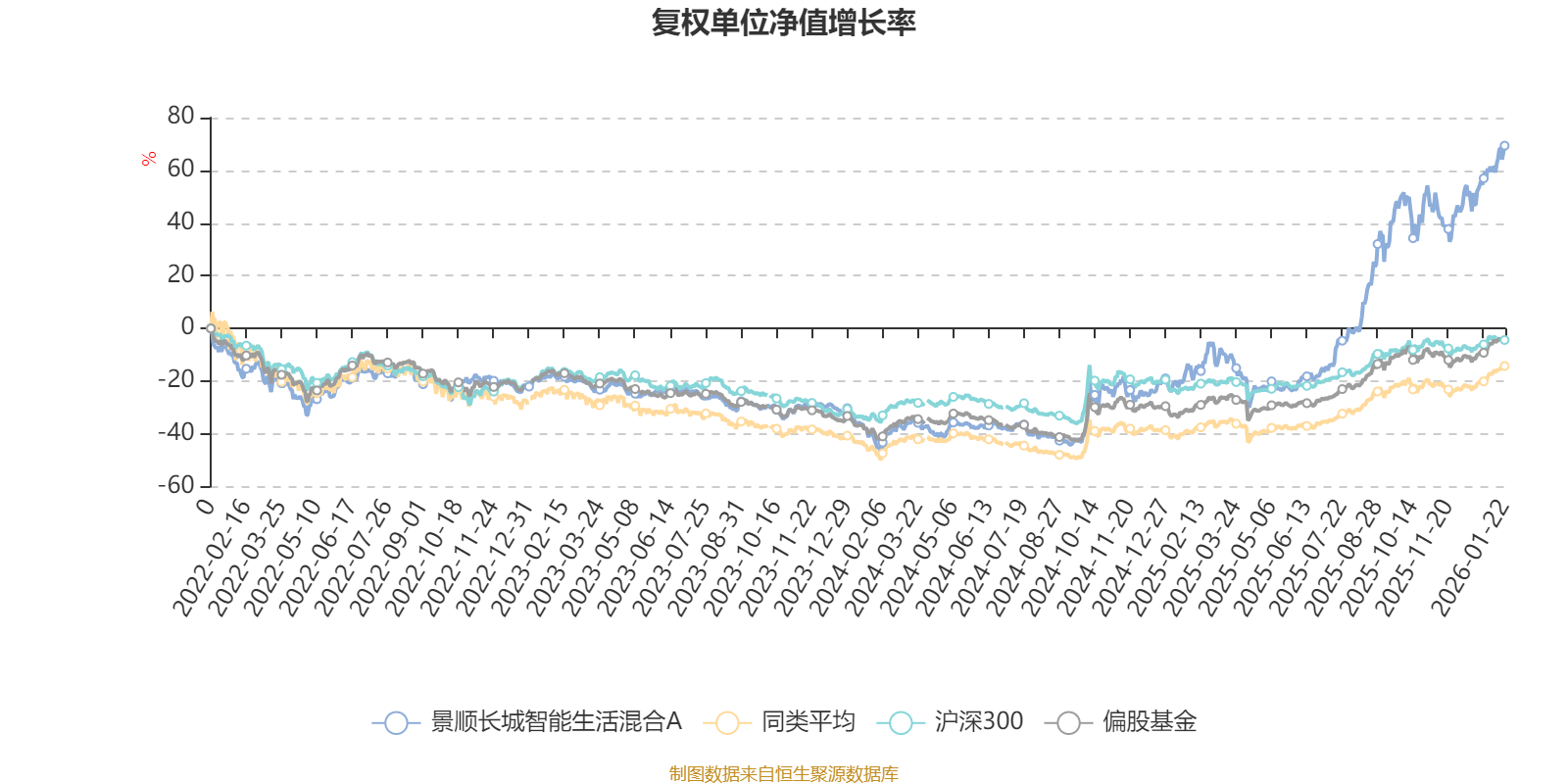 截至1月22日,景顺长城智能生活混合A近三个月复权单位净值增长率为18.98%,位于同类可比基金50/621;近半年复权单位净值增长率为77.59%,位于同类可比基金7/621;近一年复权单位净值增长率为95.67%,位于同类可比基金17/613;近三年复权单位净值增长率为106.99%,位于同类可比基金7/535。