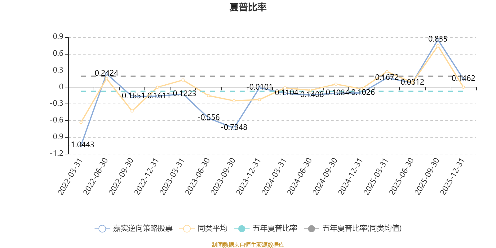 截至12月31日,基金近三年夏普比率为-0.1466,位于同类可比基金156/156。