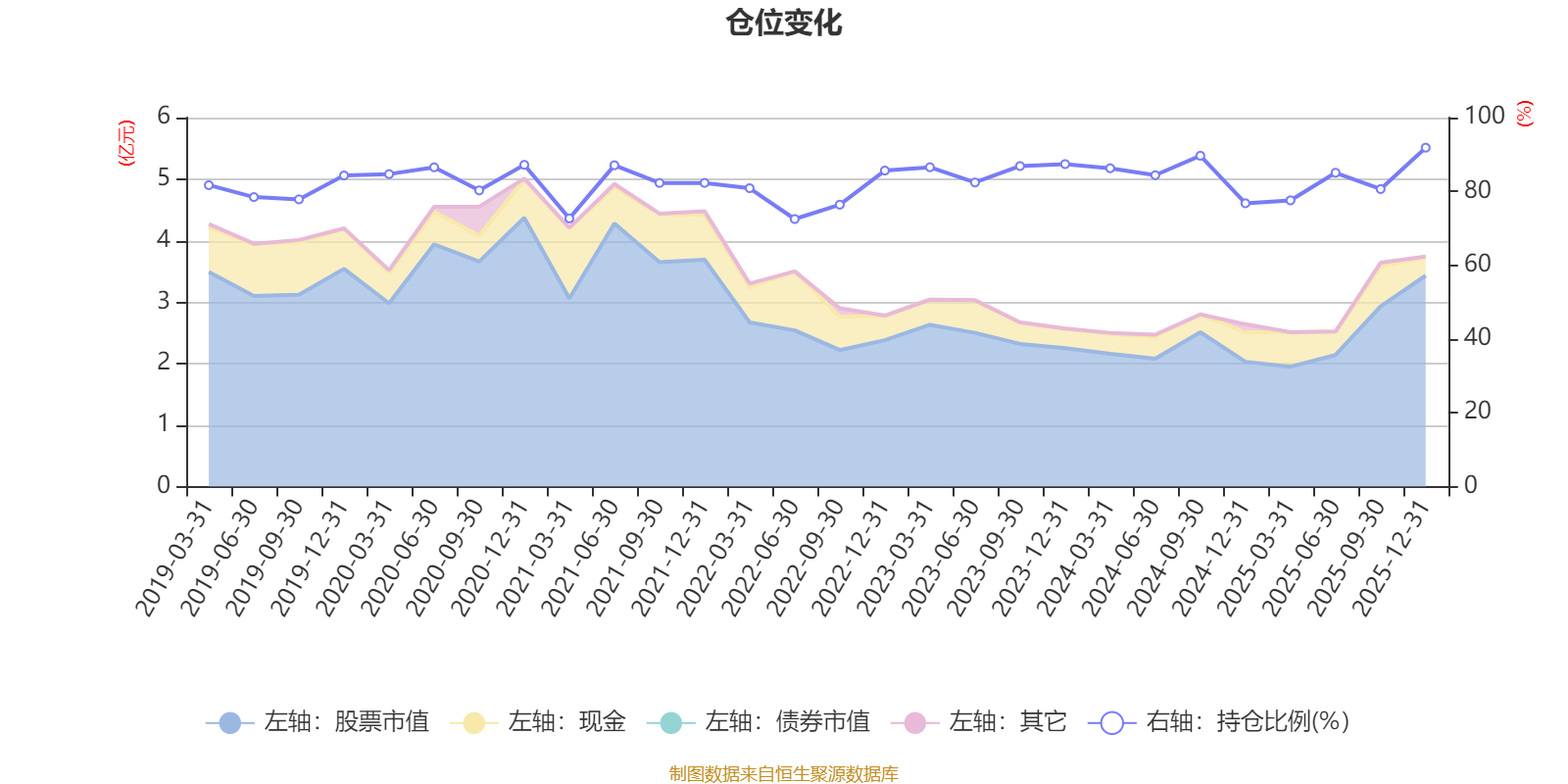 据定期报告数据统计,近三年平均股票仓位为84.62%,同类平均为85.83%。2025年末基金达到91.85%的最高仓位,2022年上半年末最低,为72.51%。