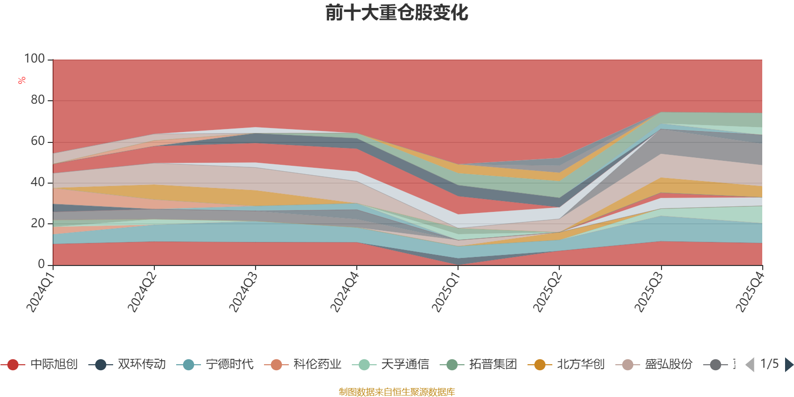 截至2025年四季度末,基金十大重仓股分别是中际旭创、工业富联、新易盛、宁德时代、天孚通信、东山精密、沪电股份、寒武纪、生益科技、海光信息。