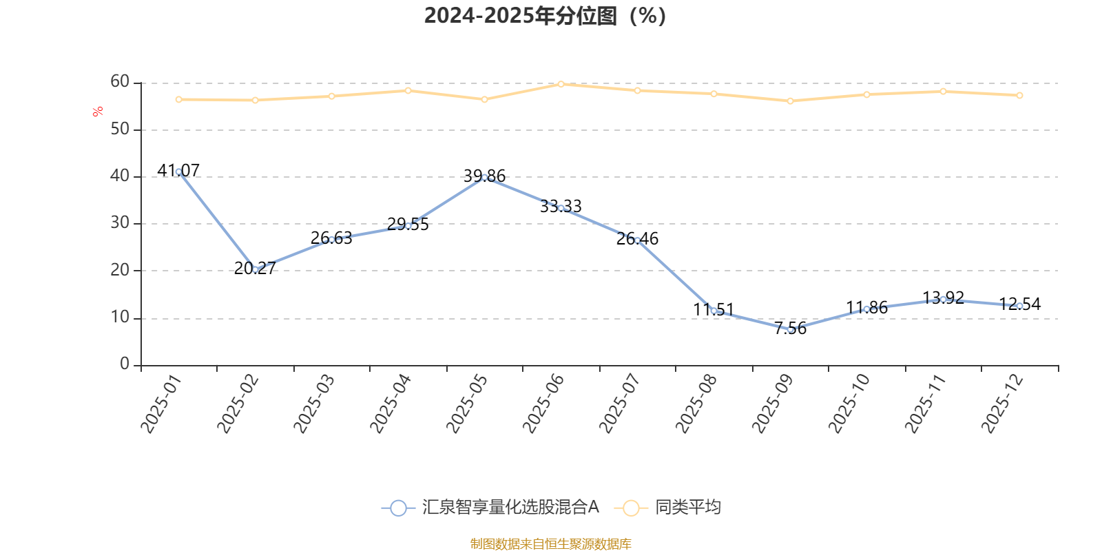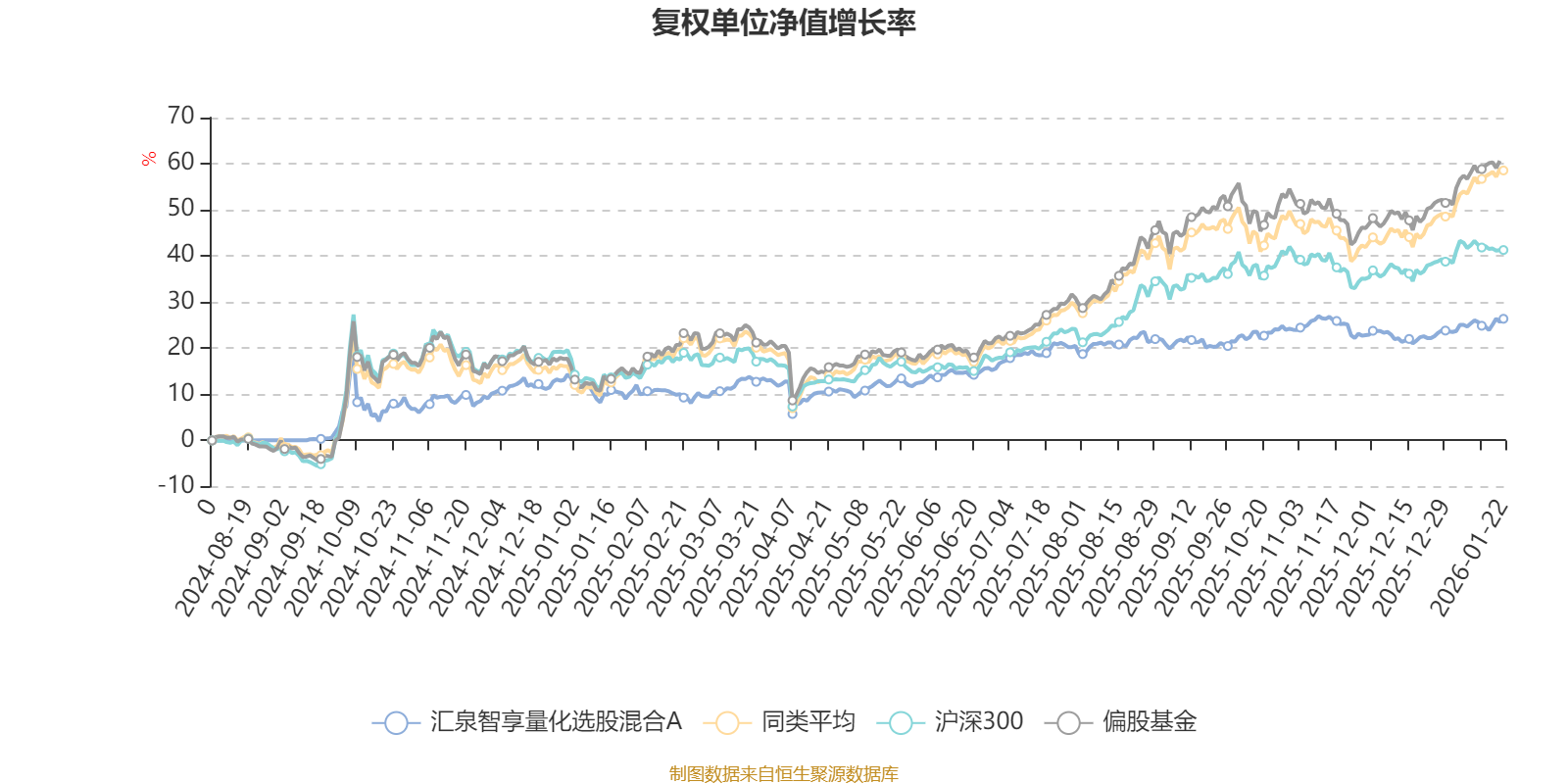 截至1月22日,汇泉智享量化选股混合A近三个月复权单位净值增长率为2.45%,位于同类可比基金576/689;近半年复权单位净值增长率为4.39%,位于同类可比基金620/689;近一年复权单位净值增长率为15.89%,位于同类可比基金603/673。