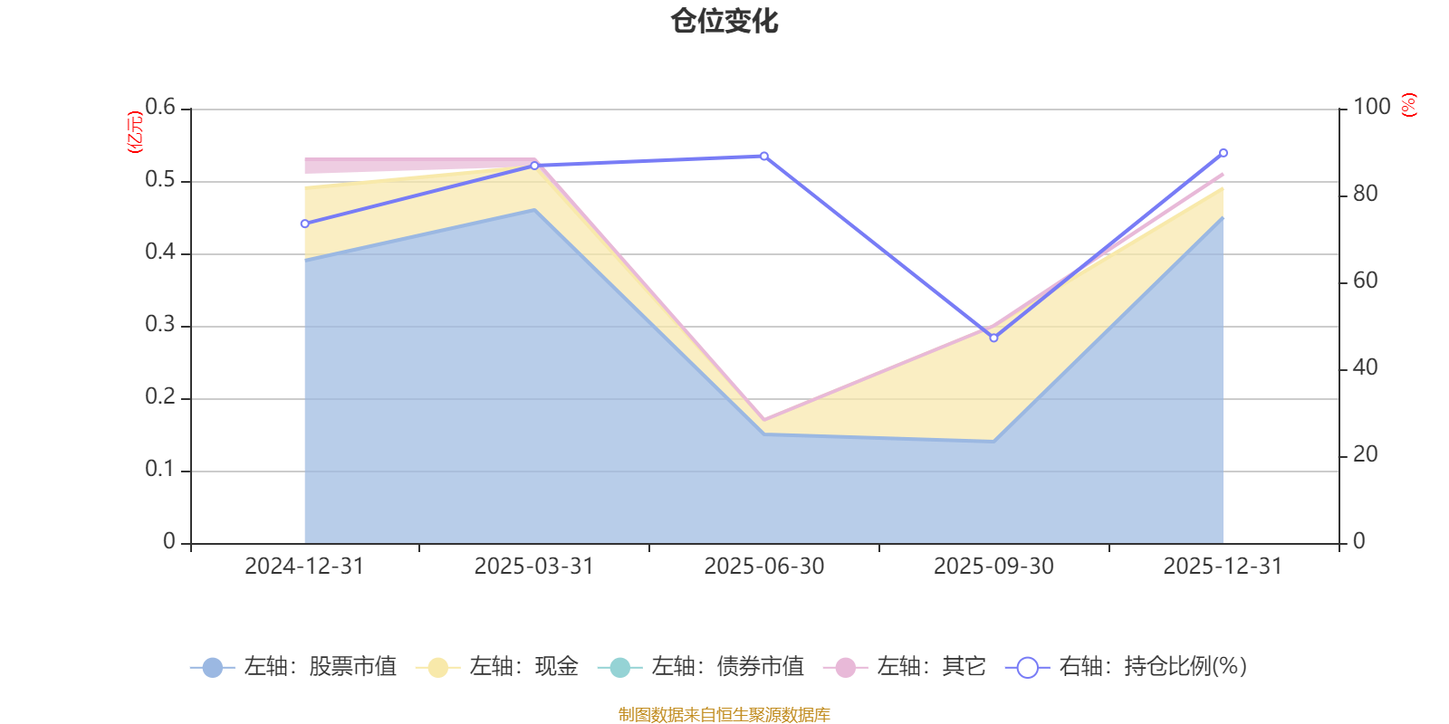 据定期报告数据统计,成立以来平均股票仓位为77.29%,同类平均为84.04%。2025年末基金达到89.81%的最高仓位,2025年三季度末最低,为47.21%。