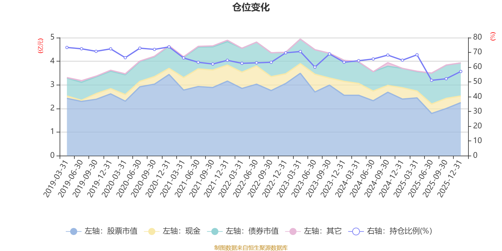 据定期报告数据统计,近三年平均股票仓位为62.88%,同类平均为72.57%。2020年末基金达到73.74%的最高仓位,2025年上半年末最低,为51.09%。