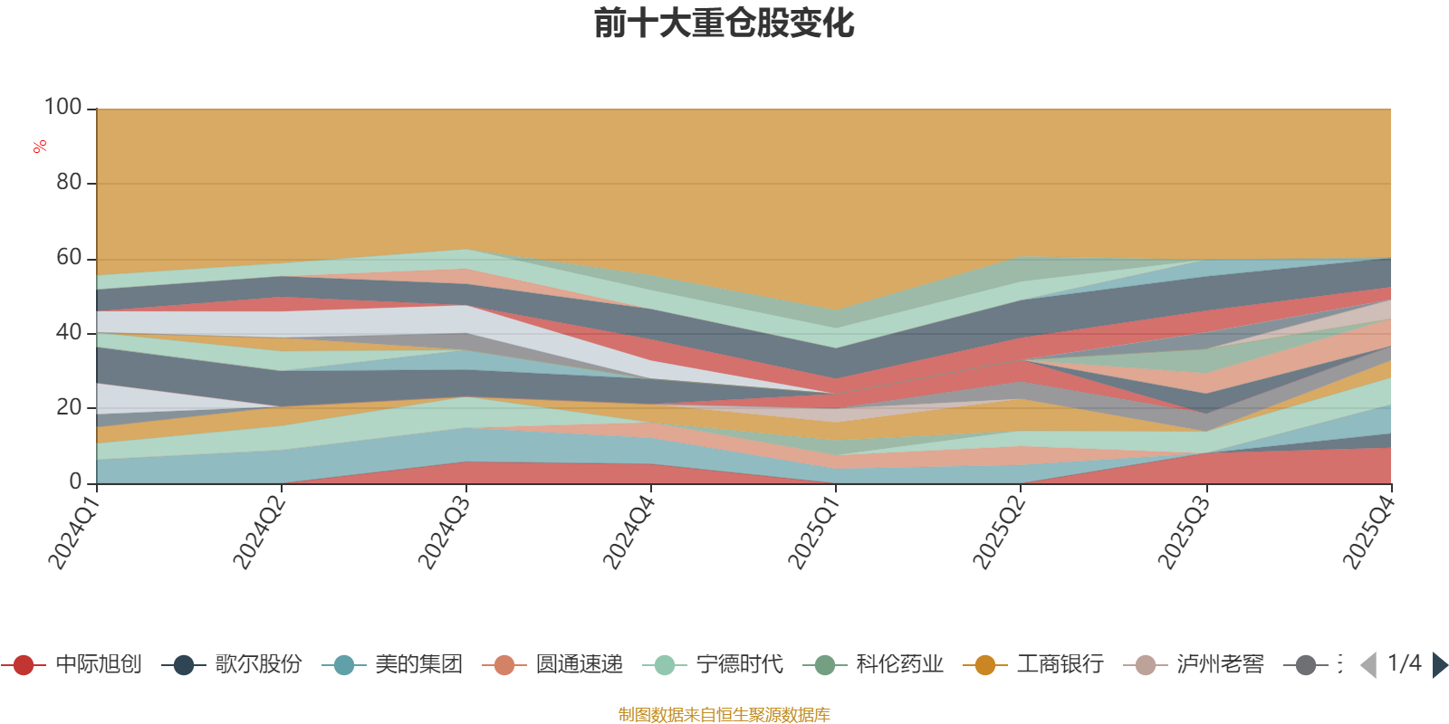 截至2025年四季度末,基金十大重仓股分别是中际旭创、贵州茅台、美的集团、新易盛、宁德时代、农业银行、工商银行、歌尔股份、开润股份、耐普矿机。