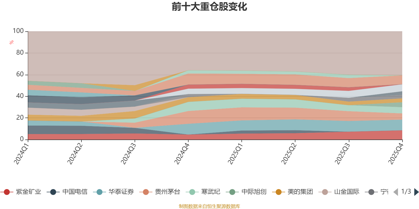 该基金持股集中度较高。截至2025年四季度末,基金十大重仓股分别是华泰证券、紫金矿业、中信证券、北方华创、贵州茅台、寒武纪、中际旭创、美的集团、中金黄金、宁德时代。