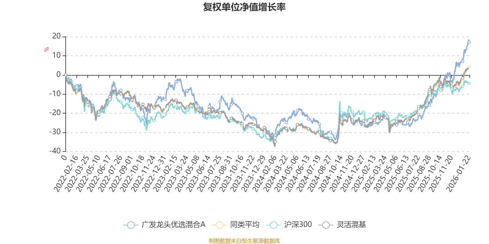 截至1月22日,广发龙头优选混合A近三个月复权单位净值增长率为23.73%,位于同类可比基金80/1286;近半年复权单位净值增长率为47.45%,位于同类可比基金174/1286;近一年复权单位净值增长率为58.46%,位于同类可比基金226/1286;近三年复权单位净值增长率为25.02%,位于同类可比基金459/1286。