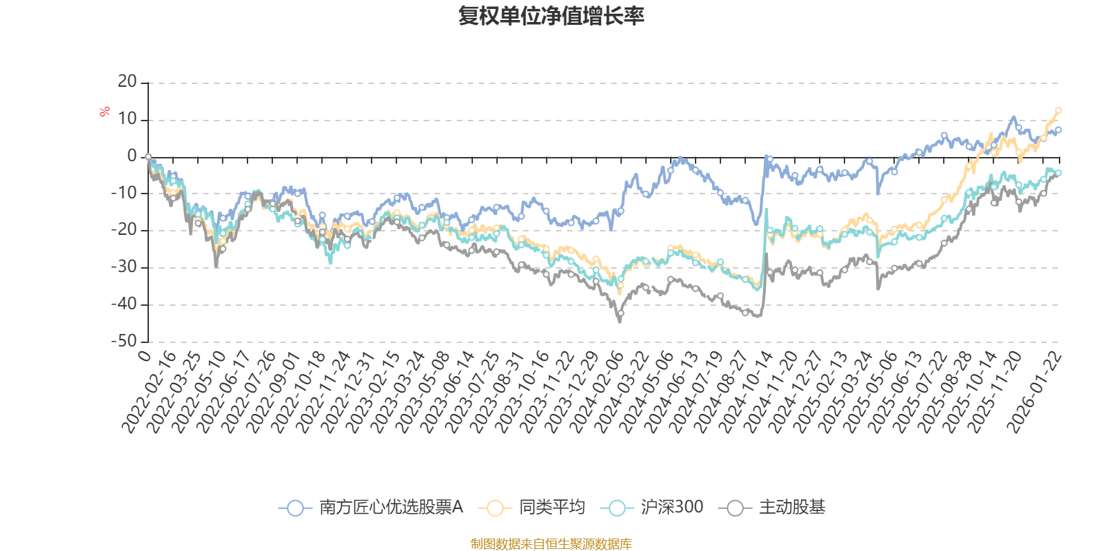 截至1月22日,南方匠心优选股票A近三个月复权单位净值增长率为1.85%,位于同类可比基金49/58;近半年复权单位净值增长率为1.40%,位于同类可比基金56/58;近一年复权单位净值增长率为14.61%,位于同类可比基金56/57;近三年复权单位净值增长率为22.63%,位于同类可比基金35/57。