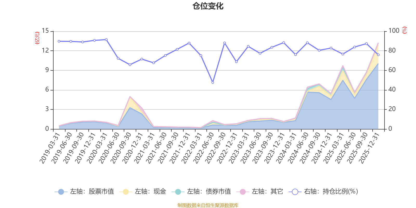 据定期报告数据统计,近三年平均股票仓位为82.1%,同类平均为86.41%。2020年一季度末基金达到91.41%的最高仓位,2022年上半年末最低,为47.69%。