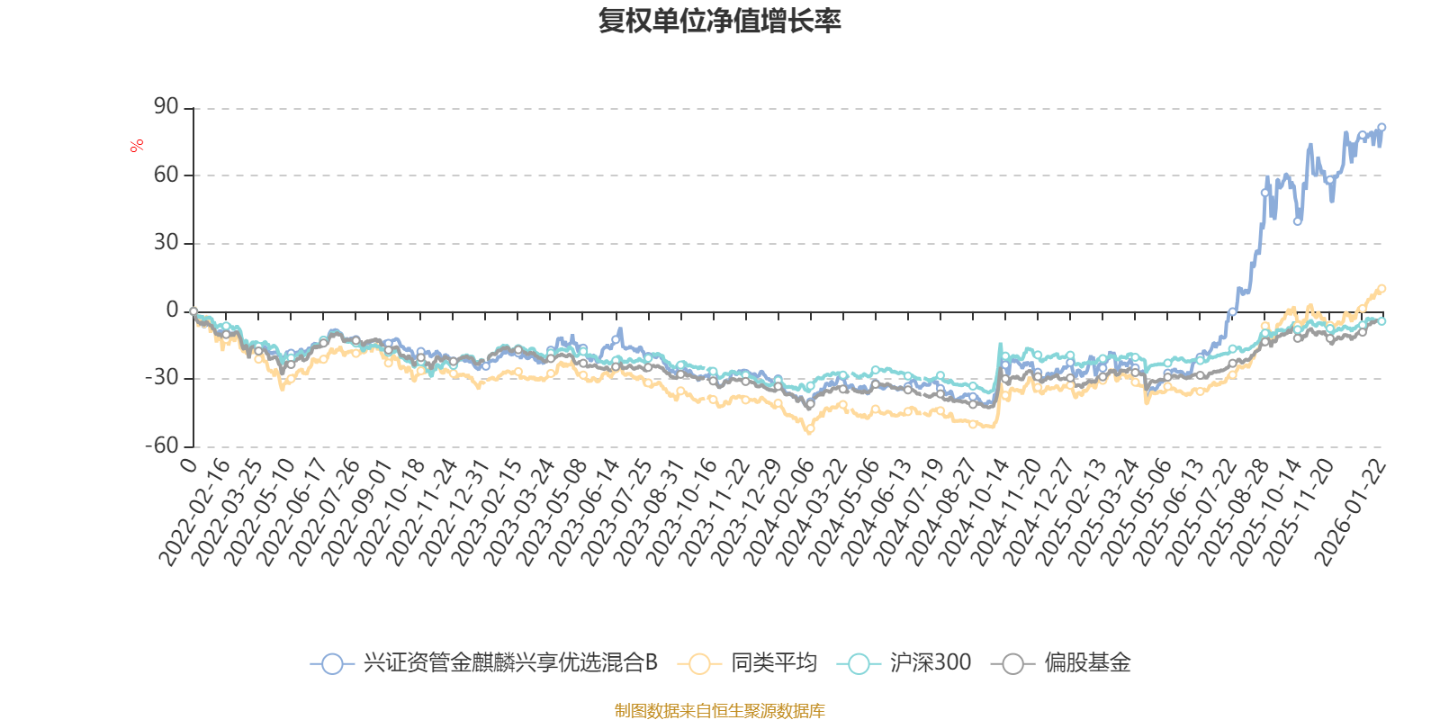 截至1月22日,兴证资管金麒麟兴享优选混合B近三个月复权单位净值增长率为15.82%,位于同类可比基金101/229;近半年复权单位净值增长率为81.86%,位于同类可比基金14/229;近一年复权单位净值增长率为125.57%,位于同类可比基金6/222;近三年复权单位净值增长率为122.69%,位于同类可比基金9/165。