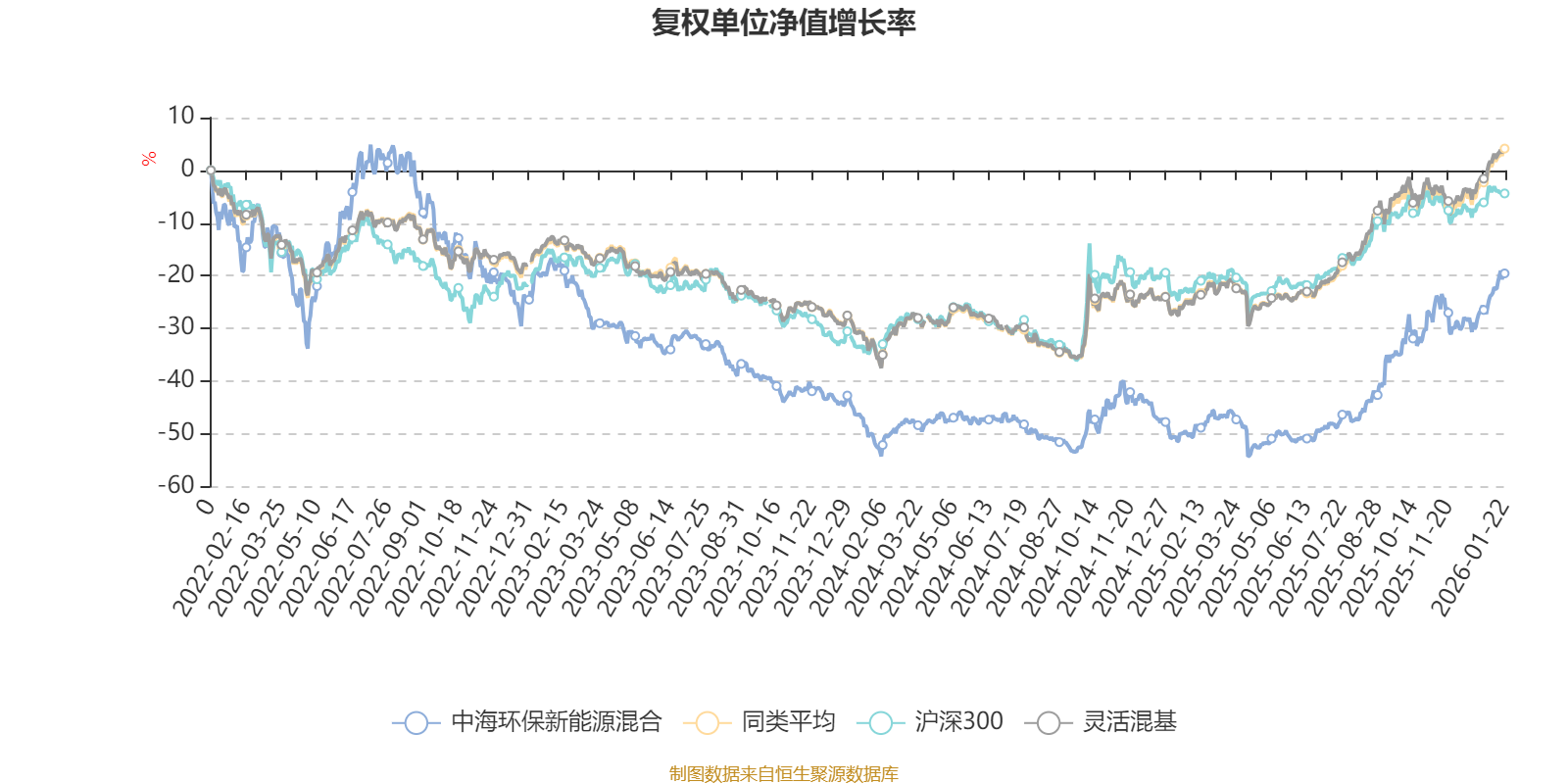 截至1月22日,中海环保新能源混合近三个月复权单位净值增长率为19.46%,位于同类可比基金143/1286;近半年复权单位净值增长率为49.94%,位于同类可比基金152/1286;近一年复权单位净值增长率为61.55%,位于同类可比基金200/1286;近三年复权单位净值增长率为-0.68%,位于同类可比基金1030/1286。