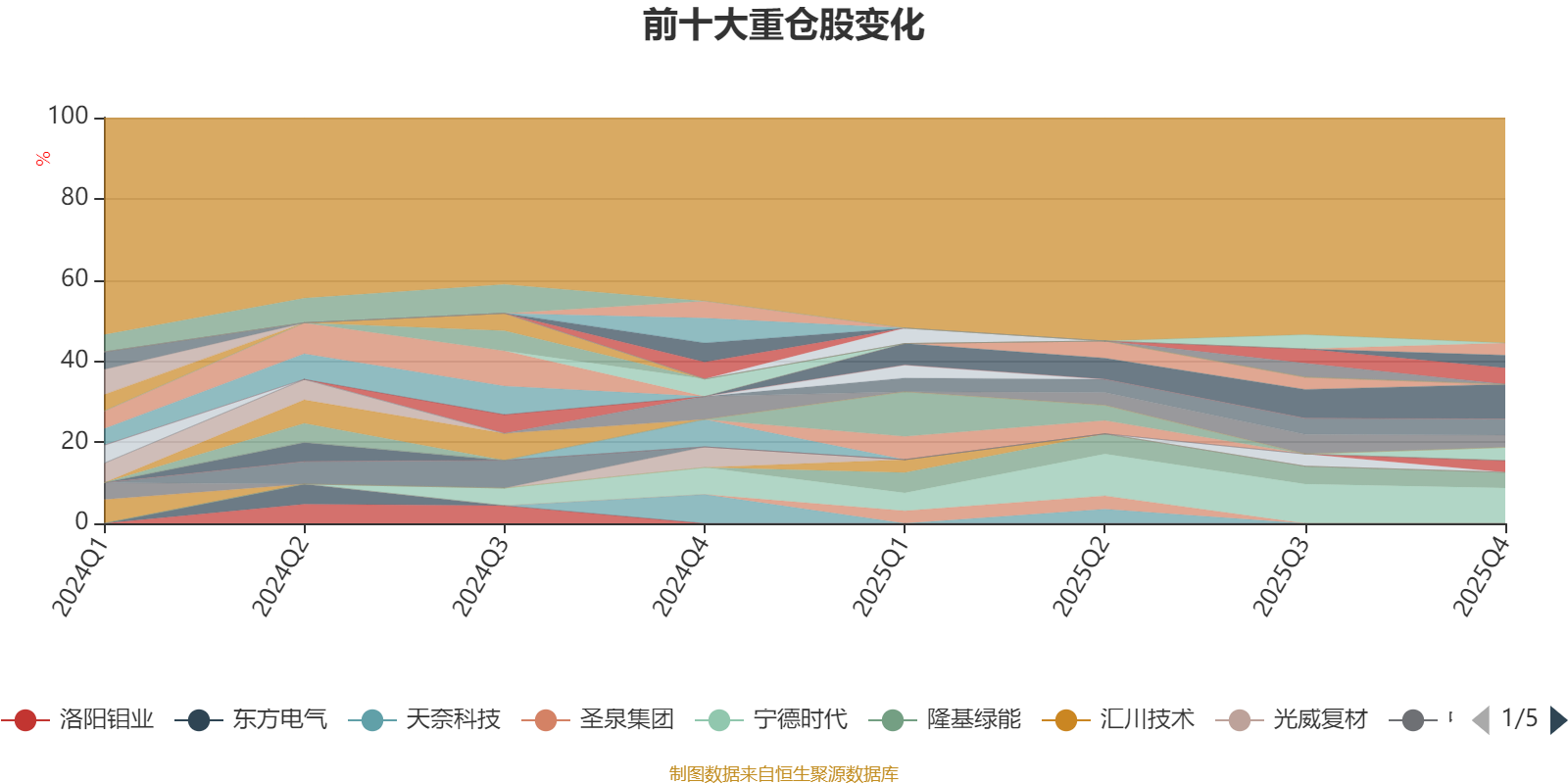 截至2025年四季度末,基金十大重仓股分别是宁德时代、阳光电源、华友钴业、特变电工、隆基绿能、迈为股份、赣锋锂业、天齐锂业、亿纬锂能、思源电气。