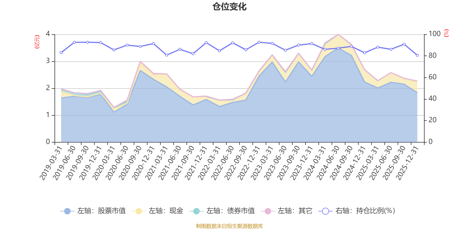 据定期报告数据统计,近三年平均股票仓位为87.41%,同类平均为88.27%。2019年三季度末基金达到92.7%的最高仓位,2025年末最低,为80.58%。