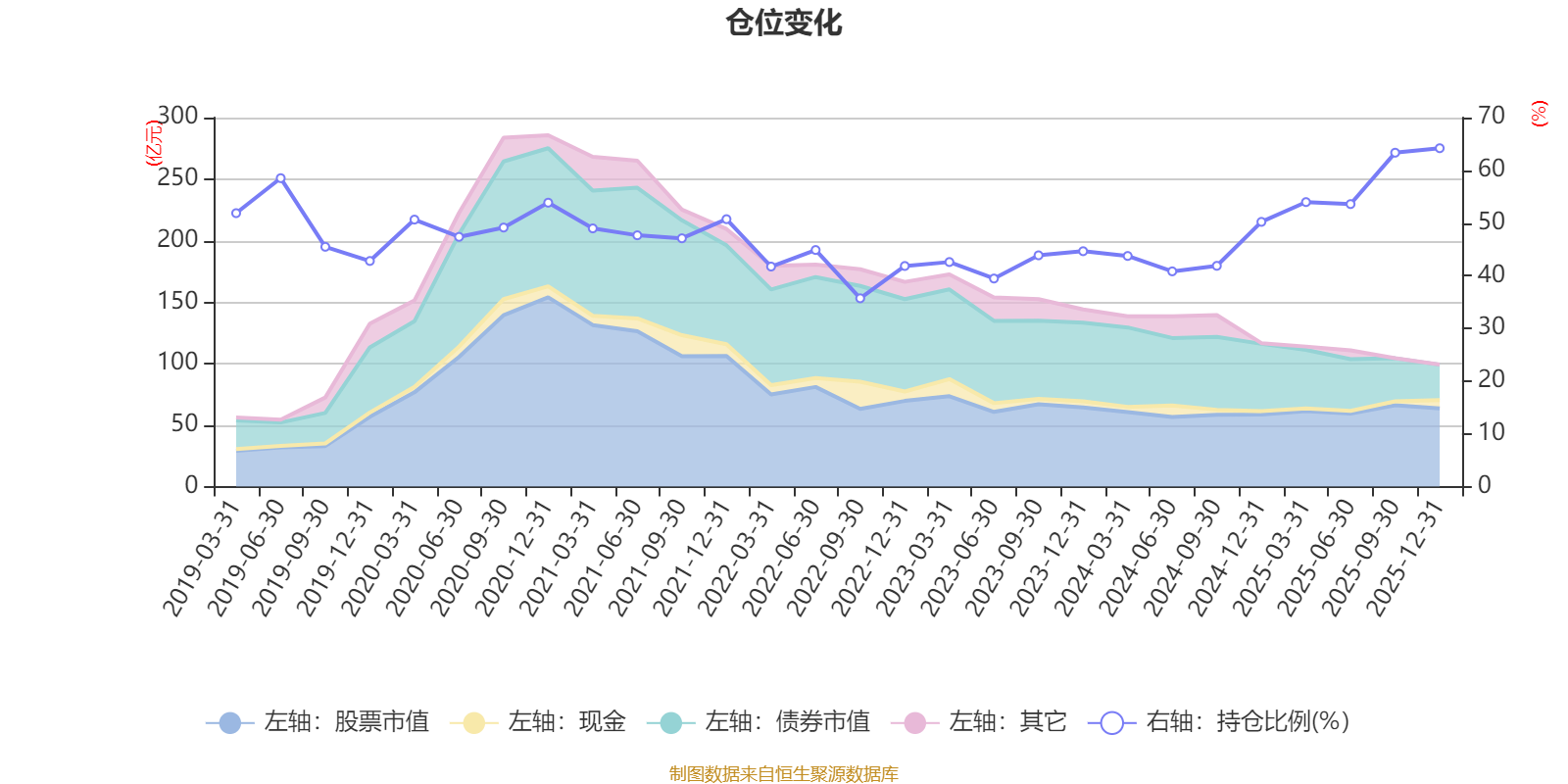 据定期报告数据统计,近三年平均股票仓位为48.53%,同类平均为67.52%。2025年末基金达到64.19%的最高仓位,2022年三季度末最低,为35.72%。