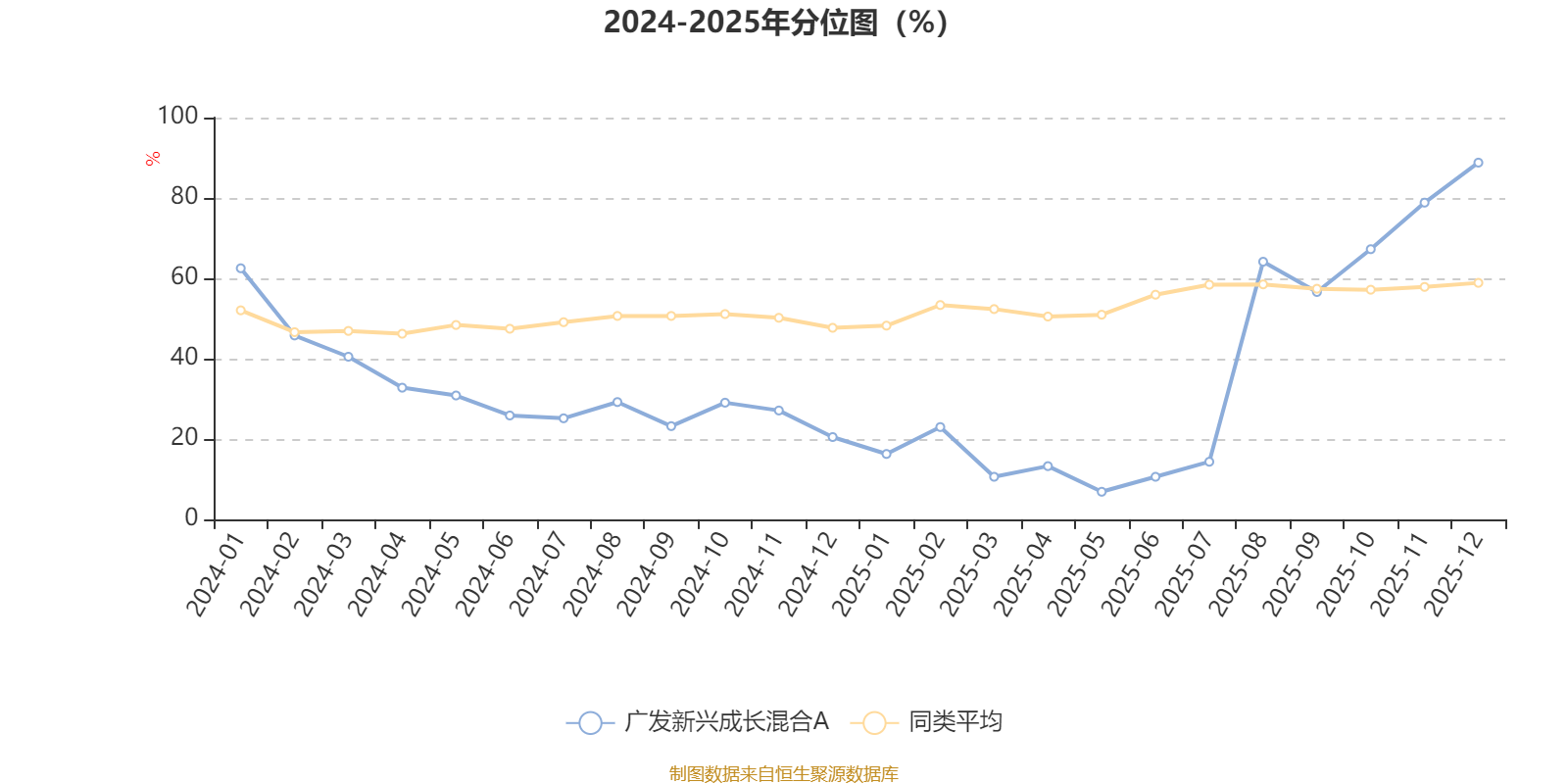 通过所选区间该基金净值增长率分位图,可以观察该基金与同类基金业绩比较情况。图为坐标原点到区间内某时点的净值增长率在同类基金中的分位数。