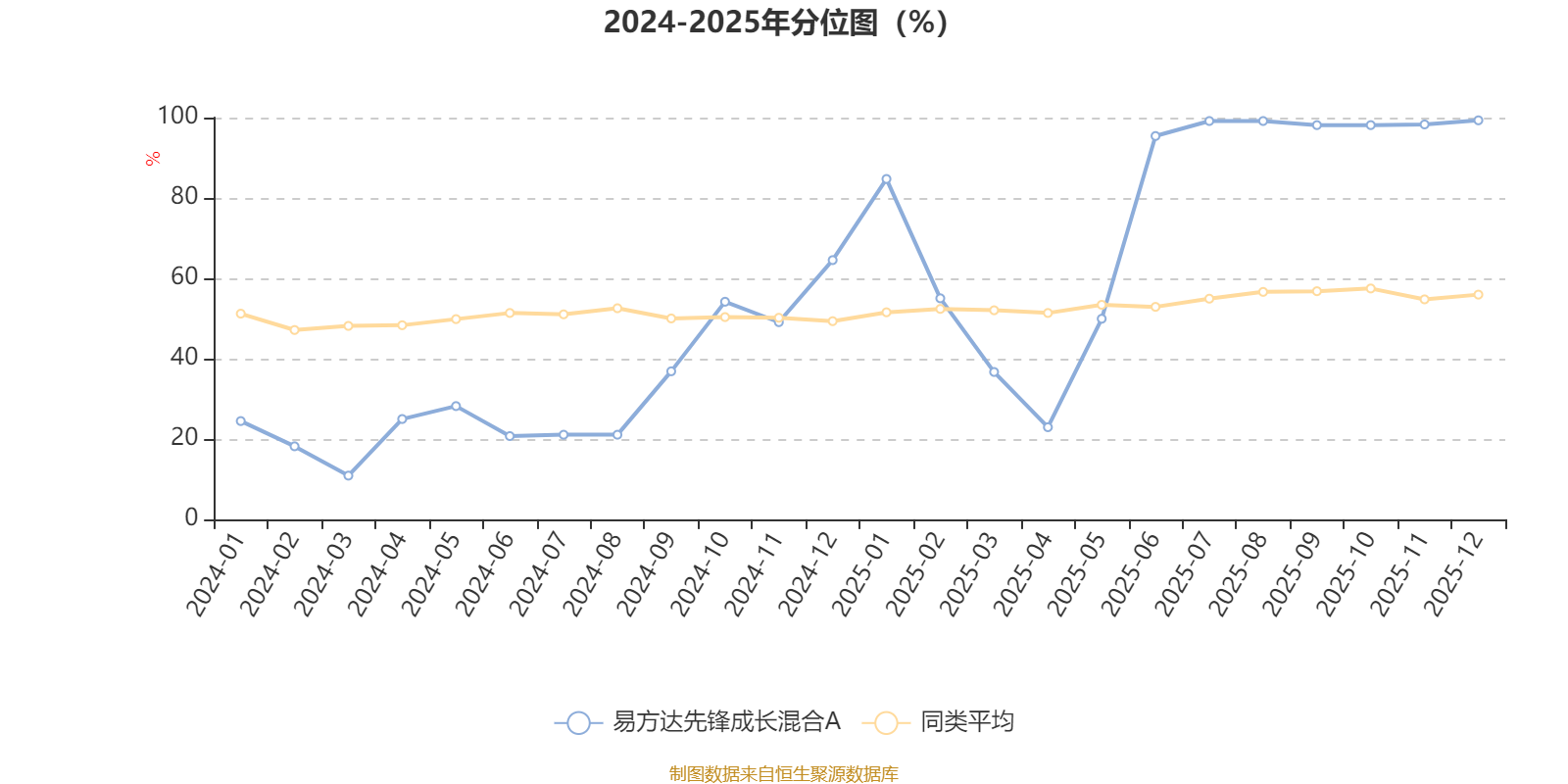 通过所选区间该基金净值增长率分位图,可以观察该基金与同类基金业绩比较情况。图为坐标原点到区间内某时点的净值增长率在同类基金中的分位数。