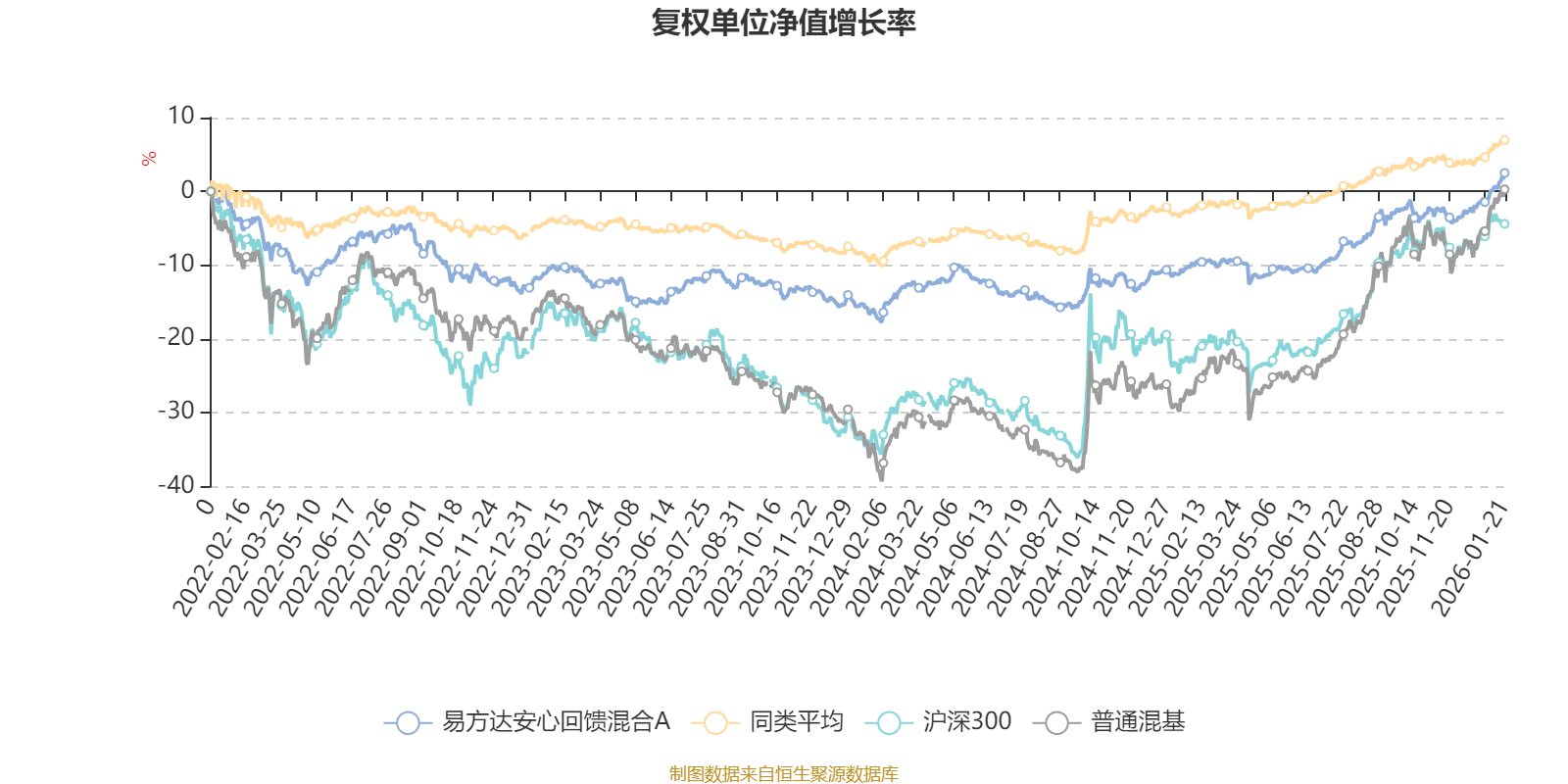 截至1月21日,易方达安心回馈混合A近三个月复权单位净值增长率为6.05%,位于同类可比基金49/629;近半年复权单位净值增长率为10.65%,位于同类可比基金64/629;近一年复权单位净值增长率为14.11%,位于同类可比基金94/626;近三年复权单位净值增长率为14.89%,位于同类可比基金183/564。